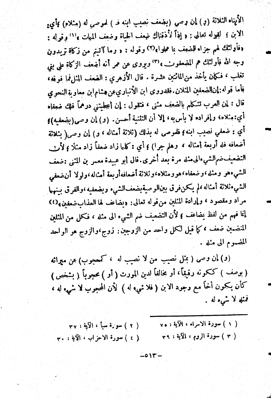 (وَ) إنْ وَصَّى (بِضِعْفِ نَصِيبِ ابْنِهِ فَ) لِمُوصَى لَهُ (مِثْلَاهُ) ؛ أَيْ: الِابْنِ؛ لِقَوْلِهِ تَعَالَى: {إِذًا لأَذَقْنَاكَ ضِعْفَ الْحَيَاةِ وَضِعْفَ الْمَمَاتِ} [الإسراء: 75] وَقَوْلِهِ: {فَأُولَئِكَ لَهُمْ جَزَاءُ الضِّعْفِ بِمَا عَمِلُوا} [سبأ: 37] وَقَوْلِهِ: {وَمَا آتَيْتُمْ مِنْ زَكَاةٍ تُرِيدُونَ وَجْهَ اللَّهِ فَأُولَئِكَ هُمُ الْمُضْعِفُونَ} [الروم: 39] وَيُرْوَى عَنْ عُمَرَ أَنَّهُ أَضْعَفَ الزَّكَاةَ عَلَى بَنِي تَغْلِبَ، فَكَانَ يَأْخُذُ مِنْ الْمِائَتَيْنِ عَشْرَةً. قَالَ الْأَزْهَرِيُّ: الضِّعْفُ الْمِثْلُ فَمَا فَوْقَهُ، فَأَمَّا قَوْلُهُ: إنَّ الضِّعْفَيْنِ الْمِثْلَانِ. فَقَدْ رَوَى ابْنُ الْأَنْبَارِيِّ عَنْ هِشَامِ بْنِ مُعَاوِيَةَ النَّحْوِيِّ قَالَ: إنَّ الْعَرَبَ تَتَكَلَّمُ بِالضِّعْفِ مُثَنَّى، فَتَقُولُ: إنْ أَعْطَيْتَنِي دِرْهَمًا فَلَكَ ضِعْفَاهُ أَيْ: مِثْلَاهُ، وَإِفْرَادُهُ لَا بَأْسَ بِهِ، إلَّا أَنَّ التَّثْنِيَةَ أَحْسَنُ.