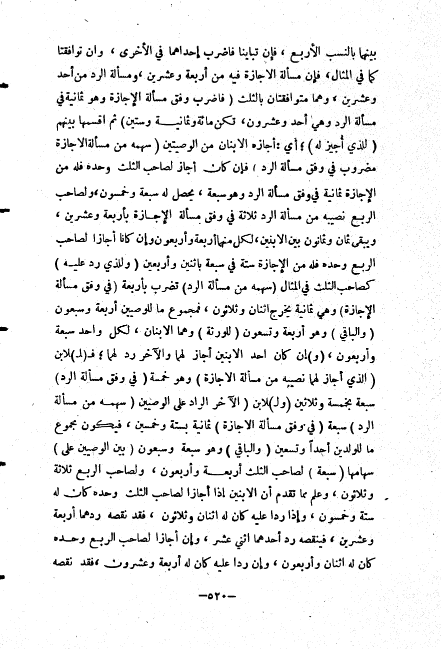 (وَ) إنْ كَانَ أَحَدُ الِابْنَيْنِ أَجَازَ لَهُمَا وَالْآخَرُ رَدَّ لَهُمَا؛ فَ (لِ) لِابْنِ (الَّذِي أَجَازَ لَهُمَا نَصِيبُهُ مِنْ مَسْأَلَةِ الْإِجَازَةِ) وَهُوَ خَمْسَةٌ (فِي وَفْقِ مَسْأَلَةِ الرَّدِّ) سَبْعَةٌ بِخَمْسَةٍ وَثَلَاثِينَ (وَلِ) لِابْنِ الْآخَرِ الرَّادِّ عَلَى الْوَصِيَّيْنِ (سَهْمُهُ مِنْ مَسْأَلَةِ الرَّدِّ) سَبْعَةٌ (فِي وَفْقِ مَسْأَلَةِ الْإِجَازَةِ) ثَمَانِيَةٌ بِسِتَّةٍ وَخَمْسِينَ، فَيَكُونُ مَجْمُوعُ مَا لِلْوَلَدَيْنِ أَحَدًا وَتِسْعِينَ (وَالْبَاقِي) وَهُوَ سَبْعَةٌ وَسَبْعُونَ (بَيْنَ الْوَصِيَّيْنِ عَلَى) سِهَامِهَا (سَبْعَةٌ) لِصَاحِبِ الثُّلُثِ أَرْبَعَةٌ وَأَرْبَعُونَ، وَلِصَاحِبِ الرُّبُعِ ثَلَاثَةٌ وَثَلَاثُونَ، وَعُلِمَ مِمَّا تَقَدَّمَ أَنَّ الِابْنَيْنِ إذَا أَجَازَا لِصَاحِبِ الثُّلُثِ وَحْدَهُ كَانَ لَهُ سِتَّةٌ وَخَمْسُونَ، وَإِذَا رَدَّا عَلَيْهِ كَانَ لَهُ اثْنَانِ وَثَلَاثُونَ، فَقَدْ نَقَصَهُ رَدُّهُمَا أَرْبَعَةً وَعِشْرِينَ، فَيَنْقُصُهُ رَدُّ أَحَدِهِمَا اثْنَيْ عَشَرَ، وَإِنْ أَجَازَا لِصَاحِبِ الرُّبُعِ وَحْدَهُ كَانَ لَهُ اثْنَانِ وَأَرْبَعُونَ، وَإِنْ رَدَّا عَلَيْهِ كَانَ لَهُ أَرْبَعَةٌ وَعِشْرُونَ، فَقَدْ نَقَصَهُ