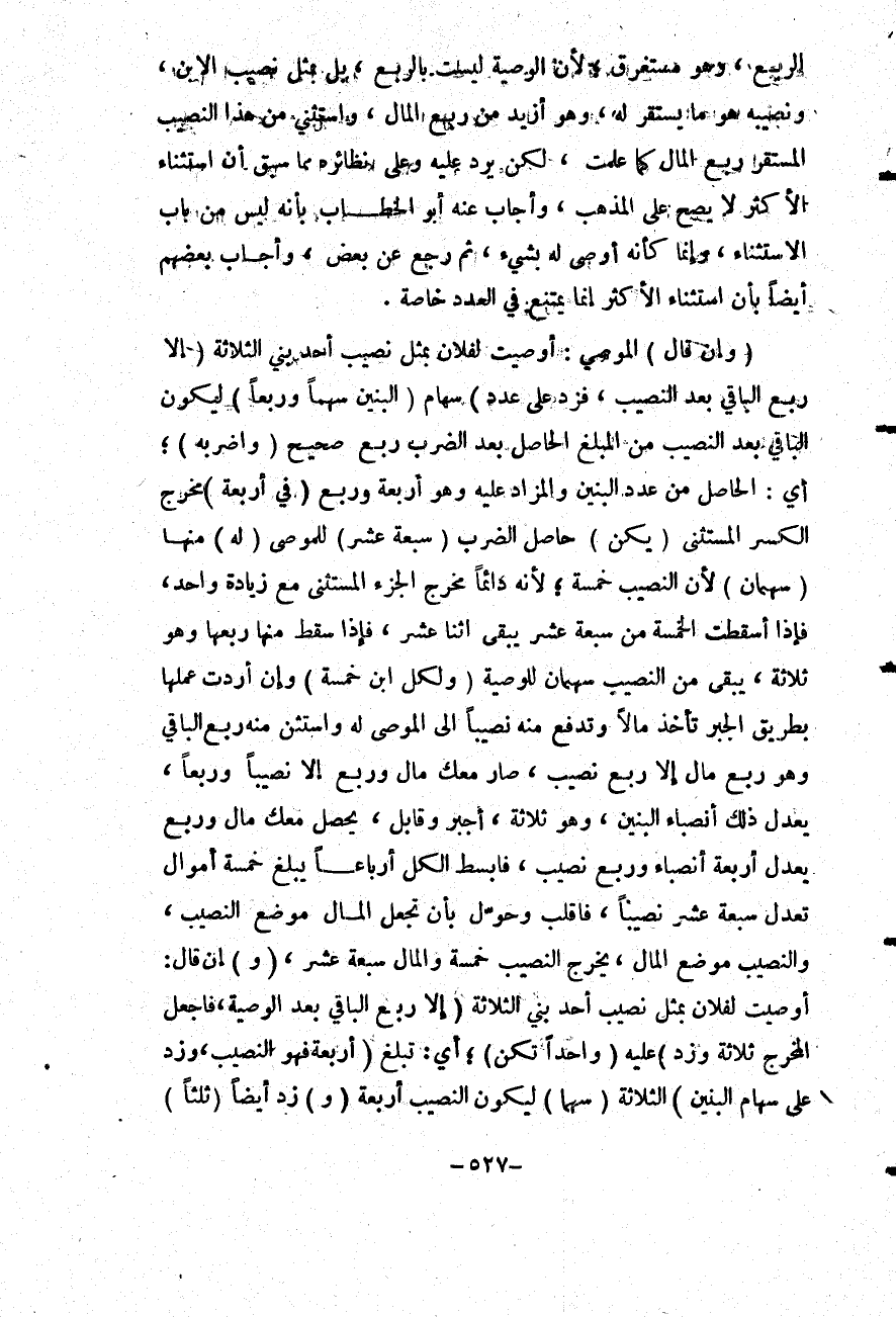 (وَإِنْ قَالَ) الْمُوصِي: أَوْصَيْتُ لِفُلَانٍ بِمِثْلِ نَصِيبِ أَحَدِ بَنِيَّ الثَّلَاثَةِ (إلَّا رُبُعَ الْبَاقِي بَعْدَ النَّصِيبِ، فَزِدْ عَلَى عَدَدِ) سِهَامِ (الْبَنِينَ سَهْمًا وَرُبُعًا) لِيَكُونَ الْبَاقِي بَعْدَ النَّصِيبِ مِنْ الْمَبْلَغِ الْحَاصِلِ بَعْدَ الضَّرْبِ رُبُعًا صَحِيحًا (وَاضْرِبْهُ) ؛ أَيْ: الْحَاصِلَ مِنْ عَدَدِ الْبَنِينَ وَالْمُزَادَ عَلَيْهِ وَهُوَ أَرْبَعَةٌ وَرُبُعٌ (فِي أَرْبَعَةٍ) مَخْرَجِ الْكَسْرِ الْمُسْتَثْنَى (يَكُنْ) حَاصِلُ الضَّرْبِ (سَبْعَةَ عَشَرَ) لِلْمُوصَى (لَهُ) مِنْهَا (سَهْمَانِ) لِأَنَّ النَّصِيبَ خَمْسَةٌ؛ لِأَنَّهُ دَائِمًا مَخْرَجُ الْجُزْءِ الْمُسْتَثْنَى مَعَ زِيَادَةِ وَاحِدٍ، فَإِذَا أَسْقَطْتَ الْخَمْسَةَ مِنْ سَبْعَةَ عَشَرَ يَبْقَى اثْنَا عَشَرَ، فَإِذَا سَقَطَ مِنْهَا رُبُعُهَا وَهُوَ ثَلَاثَةٌ، يَبْقَى مِنْ النَّصِيبِ سَهْمَانِ لِلْوَصِيَّةِ (وَلِكُلِّ ابْنٍ خَمْسَةٌ) وَإِنْ أَرَدْتَ عَمَلَهَا بِطَرِيقِ الْجَبْرِ تَأْخُذُ مَالًا وَتَدْفَعُ مِنْهُ نَصِيبًا إلَى الْمُوصَى لَهُ وَاسْتَثْنِ مِنْهُ رُبُعَ الْبَاقِي وَهُوَ رُبُعُ مَالٍ إلَّا رُبُعَ نَصِيبٍ، صَارَ مَعَكَ مَالٌ وَرُبُعٌ إلَّا نَصِيبًا وَرُبُعًا، يَعْدِلُ ذَلِكَ أَنْصِبَاءَ الْبَنِينَ، وَهُوَ ثَلَاثَةٌ، أَجْبِرْ وَقَابِلْ، يَحْصُلْ مَعَكَ مَالٌ وَرُبُعٌ يَعْدِلُ أَرْبَعَةَ أَنْصِبَاءٍ وَرُبُعَ نَصِيبٍ، فَابْسُطْ الْكُلَّ أَرْبَاعًا يَبْلُغُ خَمْسَةَ أَمْوَالٍ تَعْدِلُ سَبْعَةَ عَشَرَ نَصِيبًا، فَاقْلِبْ وَحَوِّلْ بِأَنْ تَجْعَلَ الْمَالَ مَوْضِعَ النَّصِيبِ، وَالنَّصِيبَ مَوْضِعَ الْمَالِ، يَخْرُجُ النَّصِيبُ خَمْسَةً وَالْمَالُ سَبْعَةَ عَشَرَ.