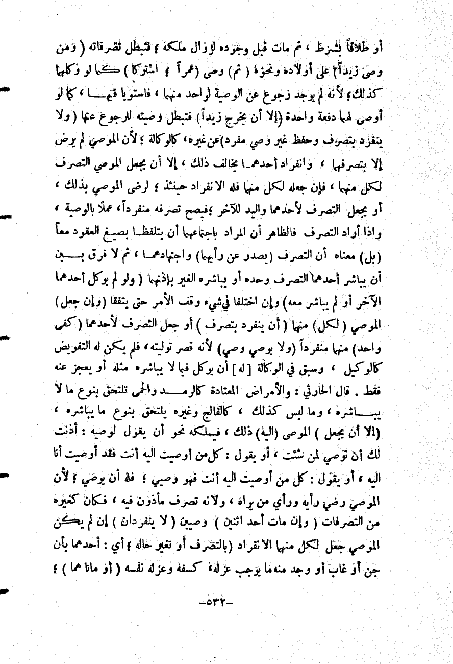 قَالَ الْحَارِثِيُّ: وَالْأَمْرَاضُ الْمُعْتَادَةُ كَالرَّمَدِ وَالْحُمَّى تَلْتَحِقُ بِنَوْعِ مَا لَا يُبَاشِرُهُ، وَمَا لَيْسَ كَذَلِكَ، كَالْفَالِجِ وَغَيْرِهِ يَلْتَحِقُ بِنَوْعِ مَا يُبَاشِرُهُ، (إلَّا أَنْ يَجْعَلَ) الْمُوصَى (إلَيْهِ) ذَلِكَ، فَيَمْلِكُهُ نَحْوَ أَنْ يَقُولَ لِوَصِيِّهِ: أَذِنْت لَك أَنْ تُوصِيَ لِمَنْ شِئْت، أَوْ يَقُولَ: كُلُّ مَنْ أَوْصَيْت إلَيْهِ أَنْتَ فَقَدْ أَوْصَيْت أَنَا إلَيْهِ، أَوْ يَقُولَ: كُلُّ مَنْ أَوْصَيْت إلَيْهِ أَنْتَ فَهُوَ وَصِيِّي؛ فَلَهُ أَنْ يُوصِيَ؛ لِأَنَّ الْمُوصِيَ رَضِيَ رَأْيَهُ وَرَأْيَ مَنْ يَرَاهُ، وَلِأَنَّهُ تَصَرُّفٌ مَأْذُونٌ فِيهِ، فَكَانَ كَغَيْرِهِ مِنْ التَّصَرُّفَاتِ (وَإِنْ مَاتَ أَحَدُ اثْنَيْنِ) وَصِيَّيْنِ (لَا يَنْفَرِدَانِ) إنْ لَمْ يَكُنْ الْمُوصِي جَعَلَ لِكُلٍّ مِنْهُمَا الِانْفِرَادَ (بِالتَّصَرُّفِ أَوْ تَغَيَّرَ حَالُهُ) ؛ أَيْ: أَحَدِهِمَا بِأَنْ جُنَّ أَوْ غَابَ أَوْ وُجِدَ مِنْهُ مَا يُوجِبُ عَزْلُهُ، كَسَفَهٍ وَعَزْلِهِ نَفْسَهُ (أَوْ مَاتَا هُمَا) ؛