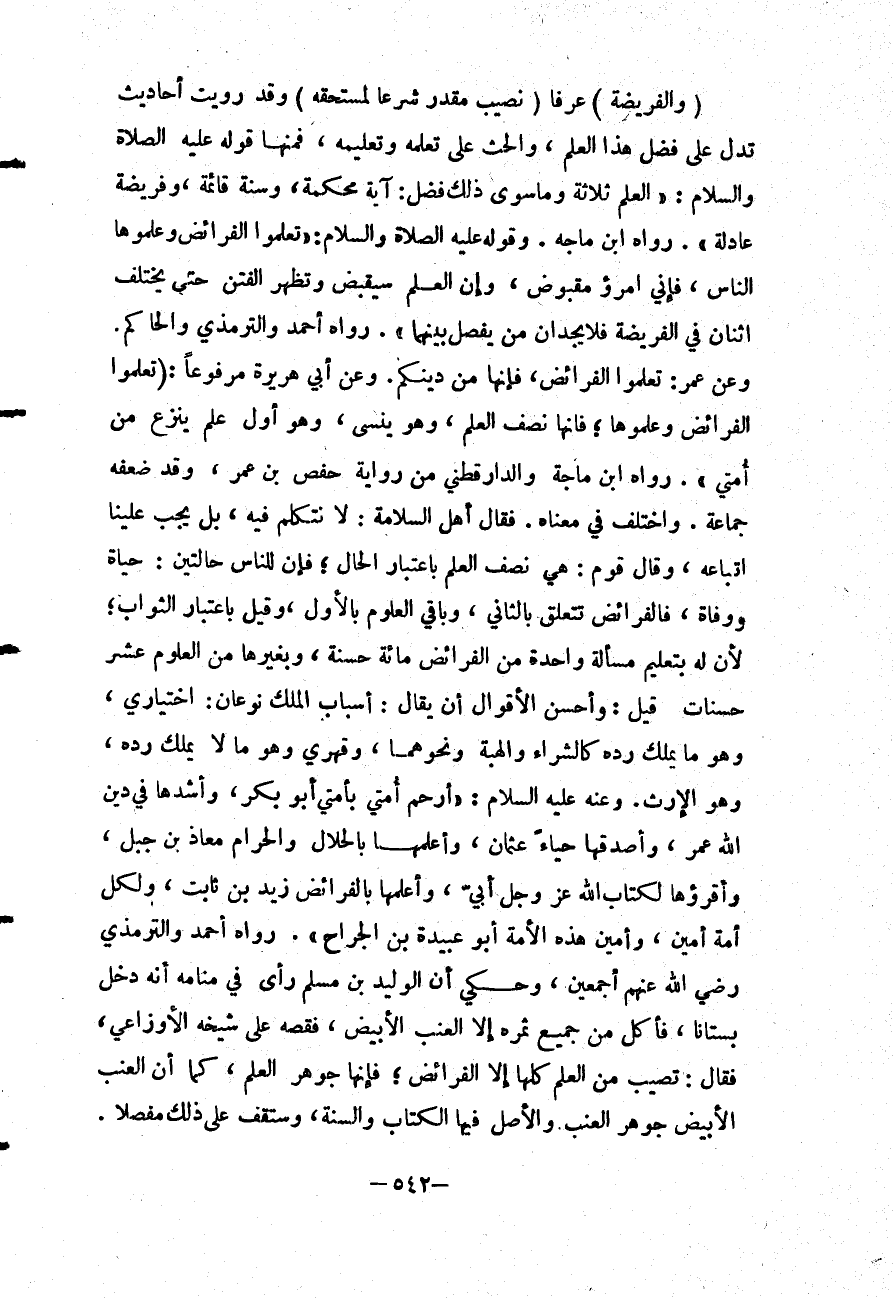 وَقَوْلُهُ - عَلَيْهِ الصَّلَاةُ وَالسَّلَامُ -: «تَعَلَّمُوا الْفَرَائِضَ وَعَلِّمُوهَا النَّاسَ، فَإِنِّي امْرُؤٌ مَقْبُوضٌ، وَإِنَّ الْعِلْمَ سَيُقْبَضُ وَتَظْهَرُ الْفِتَنُ حَتَّى يَخْتَلِفَ اثْنَانِ فِي الْفَرِيضَةِ فَلَا يَجِدَانِ مَنْ يَفْصِلُ بَيْنَهُمَا» . رَوَاهُ أَحْمَدُ وَالتِّرْمِذِيُّ وَالْحَاكِمُ.