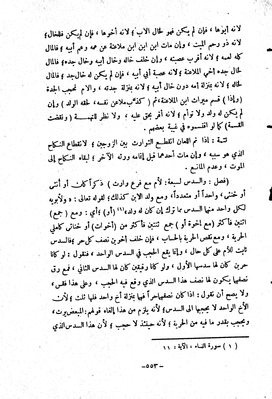 (فَصْلٌ: وَالسُّدُسُ لِسَبْعَةٍ: لِأُمٍّ مَعَ فَرْعٍ وَارِثٍ) ذَكَرًا كَانَ أَوْ أُنْثَى أَوْ خُنْثَى، وَاحِدًا أَوْ مُتَعَدِّدًا، وَمَعَ وَلَدِ الِابْنِ كَذَلِكَ؛ لِقَوْلِهِ تَعَالَى: {وَلأَبَوَيْهِ لِكُلِّ وَاحِدٍ مِنْهُمَا السُّدُسُ مِمَّا تَرَكَ إِنْ كَانَ لَهُ وَلَدٌ} [النساء: 11] (أَوْ) ؛ أَيْ: وَمَعَ (جَمْعِ) اثْنَيْنِ فَأَكْثَرَ (مَعَ إخْوَةٍ أَوْ) جَمْعِ ثِنْتَيْنِ فَأَكْثَرَ مِنْ (أَخَوَاتٍ) أَوْ خَنَاثَى كَامِلِي الْحُرِّيَّةِ، وَمَعَ نَقْصِ الْحُرِّيَّةِ بِالْحِسَابِ، فَإِنْ خَلَّفَ أَخَوَيْنِ نِصْفَ كُلِّ حُرٍّ؛ فَالسُّدُسُ ثَابِتٌ لِلْأُمِّ عَلَى كُلِّ حَالٍ، وَإِنَّمَا يَقَعُ الْحَجْبُ فِي السُّدُسِ الْوَاحِدِ، فَنَقُولُ: لَوْ كَانَا حُرَّيْنِ كَانَ لَهَا سُدُسُهَا الْأَوَّلُ، وَلَوْ كَانَا رَقِيقَيْنِ كَانَ لَهَا السُّدُسُ الثَّانِي، فَمَعَ رِقِّ نِصْفِهِمَا يَكُونُ لَهَا نِصْفُ هَذَا السُّدُسِ الَّذِي وَقَعَ فِيهِ الْحَجْبُ، وَعَلَى هَذَا فَقِسْ، وَلَا يَصِحُّ أَنْ نَقُولَ: إذَا كَانَ نِصْفُهُمَا حُرًّا فَهُمَا بِمَنْزِلَةِ أَخٍ وَاحِدٍ فَلَهَا ثُلُثٌ؛ لِأَنَّ الْأَخَ الْوَاحِدَ لَا يَحْجُبُهَا إلَى السُّدُسِ؛ لِأَنَّهُ يَلْزَمُ مِنْ هَذَا إلْغَاءُ قَوْلِهِمْ: الْمُبَعَّضُ يَرِثُ، وَيَحْجُبُ بِقَدْرِ مَا فِيهِ مِنْ الْحُرِّيَّةِ؛ لِأَنَّهُ حِينَئِذٍ لَا حَجْبَ؛ لِأَنَّ هَذَا السُّدُسَ الَّذِي