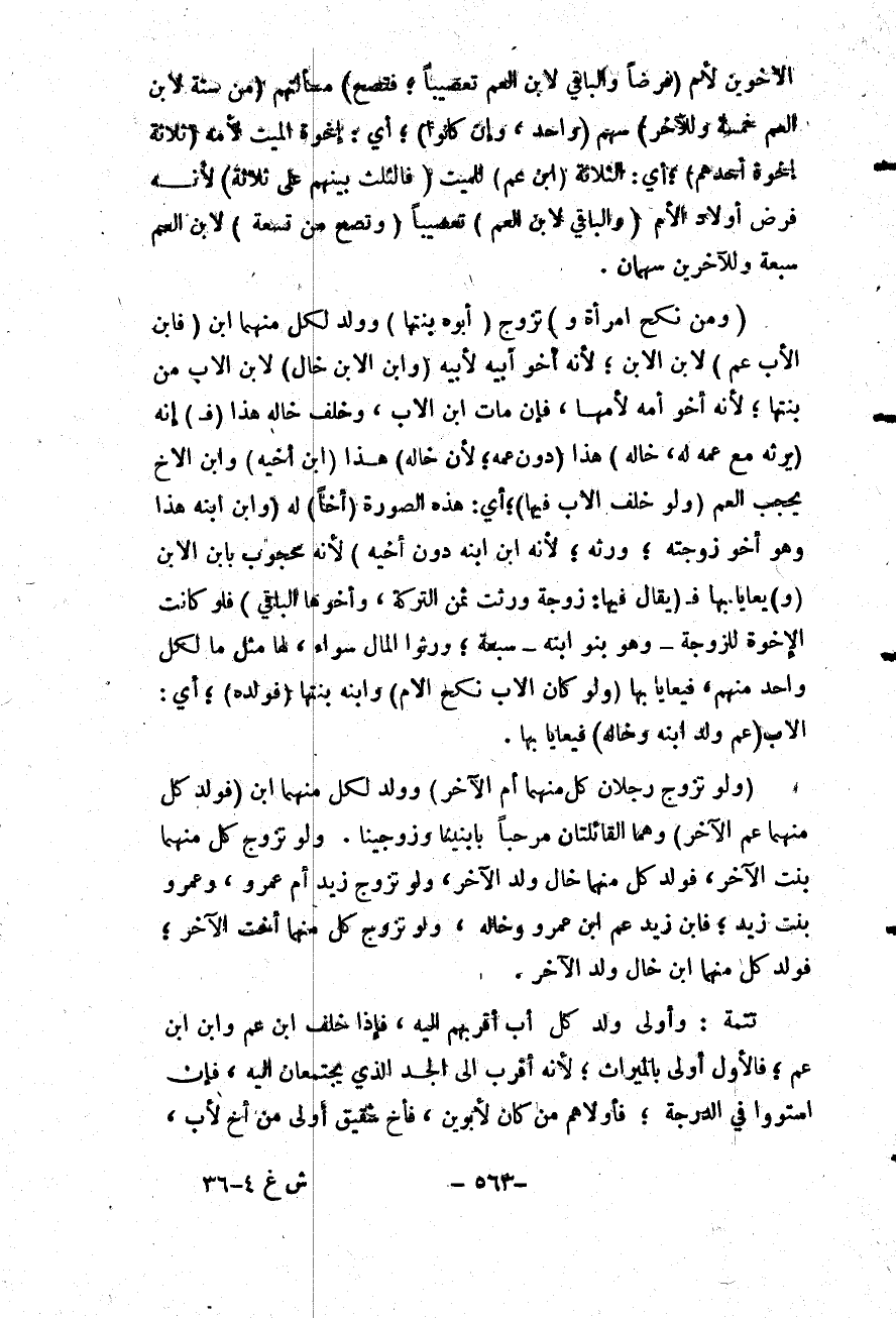 الْأَخَوَيْنِ لِأُمٍّ (فَرْضًا وَالْبَاقِي لِابْنِ الْعَمِّ تَعْصِيبًا؛ فَتَصِحُّ) مَسْأَلَتُهُمْ (مِنْ سِتَّةٍ لِابْنِ الْعَمِّ خَمْسَةٌ وَلِلْآخَرِ) سَهْمٌ (وَاحِدٌ، وَإِنْ كَانُوا) ؛ أَيْ: إخْوَةُ الْمَيِّتِ لِأُمِّهِ (ثَلَاثَةَ إخْوَةٍ أَحَدُهُمْ) ؛ أَيْ: الثَّلَاثَةِ (ابْنُ عَمٍّ) لِلْمَيِّتِ (فَالثُّلُثُ بَيْنَهُمْ عَلَى ثَلَاثَةٍ) لِأَنَّهُ فَرْضُ أَوْلَادِ الْأُمِّ (وَالْبَاقِي لِابْنِ الْعَمِّ) تَعْصِيبًا (وَتَصِحُّ مِنْ تِسْعَةٍ) لِابْنِ الْعَمِّ سَبْعَةٌ وَلِلْآخَرَيْنِ سَهْمَانِ.
