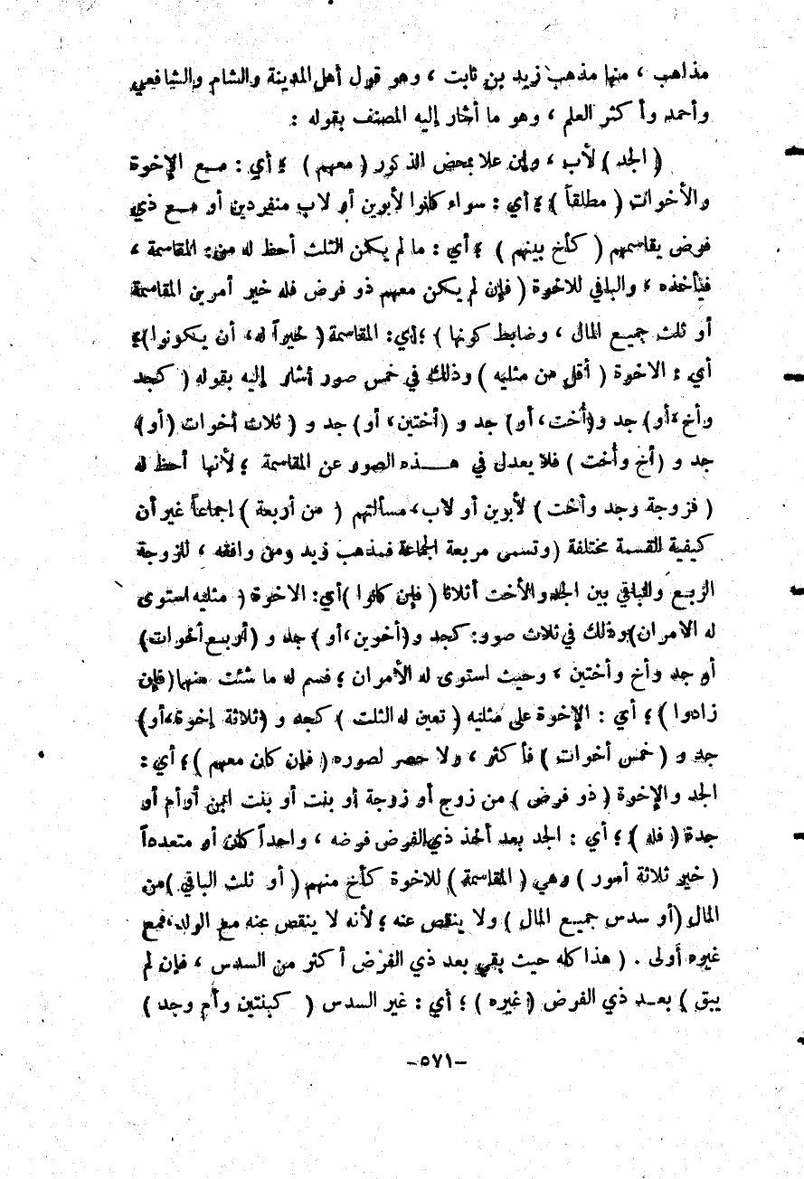 مَذَاهِبَ، مِنْهَا مَذْهَبُ زَيْدِ بْنِ ثَابِتٍ، وَهُوَ قَوْلُ أَهْلِ الْمَدِينَةِ وَالشَّامِ وَالشَّافِعِيِّ وَأَحْمَدَ وَأَكْثَرِ أَهْلِ الْعِلْمِ، وَهُوَ مَا أَشَارَ إلَيْهِ الْمُصَنِّفُ بِقَوْلِهِ: (الْجَدُّ) لِأَبٍ، وَإِنْ عَلَا بِمَحْضِ الذُّكُورِ (مَعَهُمْ) ؛ أَيْ: مَعَ الْإِخْوَةِ وَالْأَخَوَاتِ (مُطْلَقًا) ؛ أَيْ: سَوَاءٌ كَانُوا لِأَبَوَيْنِ أَوْ لِأَبٍ مُنْفَرِدِينَ أَوْ مَعَ ذِي فَرْضٍ يُقَاسِمُهُمْ (كَأَخٍ بَيْنَهُمْ) ؛ أَيْ: مَا لَمْ يَكُنْ الثُّلُثُ أَحَظَّ لَهُ مِنْ: الْمُقَاسَمَةِ، فَيَأْخُذُهُ، وَالْبَاقِي لِلْإِخْوَةِ (فَإِنْ لَمْ يَكُنْ مَعَهُمْ ذُو فَرْضٍ فَلَهُ خَيْرُ أَمْرَيْنِ الْمُقَاسَمَةُ أَوْ ثُلُثُ جَمِيعِ الْمَالِ، وَضَابِطُ كَوْنِهَا) ؛ أَيْ: الْمُقَاسَمَةِ (خَيْرًا لَهُ، أَنْ يَكُونُوا) ؛ أَيْ: الْإِخْوَةُ (أَقَلَّ مِنْ مِثْلَيْهِ) وَذَلِكَ فِي خَمْسِ صُوَرٍ أَشَارَ إلَيْهِ بِقَوْلِهِ (كَجَدٍّ وَأَخٍ، أَوْ) جَدٍّ وَ (أُخْتٍ، أَوْ) جَدٍّ وَ (أُخْتَيْنِ، أَوْ) جَدٍّ وَ (ثَلَاثِ) أَخَوَاتٍ (أَوْ) جَدٍّ وَ (أَخٍ وَأُخْتٍ) فَلَا يَعْدِلُ فِي هَذِهِ الصُّوَرِ عَنْ الْمُقَاسَمَةِ؛ لِأَنَّهَا أَحَظُّ لَهُ (فَزَوْجَةٌ وَجَدٌّ وَأُخْتٌ) لِأَبَوَيْنِ أَوْ لِأَبٍ، مَسْأَلَتُهُمْ (مِنْ أَرْبَعَةٍ) إجْمَاعًا غَيْرَ أَنَّ كَيْفِيَّةَ الْقِسْمَةِ مُخْتَلِفَةٌ (وَتُسَمَّى مُرَبَّعَةَ الْجَمَاعَةِ) فَمَذْهَبُ زَيْدٌ وَمَنْ وَافَقَهُ، لِلزَّوْجَةِ الرُّبْعُ وَالْبَاقِي بَيْنَ الْجَدِّ وَالْأُخْتِ أَثْلَاثًا (فَإِنْ كَانُوا) أَيْ: الْإِخْوَةُ (مِثْلَيْهِ اسْتَوَى لَهُ الْأَمْرَانِ) وَذَلِكَ فِي ثَلَاثِ صُوَرٍ: كَجَدٍّ وَ (أَخَوَيْنِ، أَوْ) جَدٍّ وَ (أَرْبَعِ أَخَوَاتٍ) أَوْ جَدٍّ وَأَخٍ وَأُخْتَيْنِ، وَحَيْثُ اسْتَوَى لَهُ الْأَمْرَانِ؛ فَسَمِّ لَهُ مَا شِئْت مِنْهُمَا (فَإِنْ زَادُوا) ؛ أَيْ: الْإِخْوَةُ عَلَى مِثْلَيْهِ (تَعَيَّنَ لَهُ الثُّلُثُ) كَجَدٍّ وَ (ثَلَاثَةِ إخْوَةٍ، أَوْ) جَدٍّ وَ (خَمْسِ أَخَوَاتٍ) فَأَكْثَرَ، وَلَا حَصْرَ لِصُوَرِهِ (فَإِنْ كَانَ مَعَهُمْ) ؛ أَيْ: الْجَدِّ وَالْإِخْوَةِ (ذُو فَرْضٍ) مِنْ زَوْجٍ أَوْ زَوْجَةٍ أَوْ بِنْتٍ أَوْ بِنْتِ ابْنٍ أَوْ أُمٍّ أَوْ جَدَّةٍ (فَلَهُ) ؛ أَيْ: الْجَدِّ بَعْدَ أَخْذِ ذِي الْفَرْضِ فَرْضَهُ، وَاحِدًا كَانَ أَوْ مُتَعَدِّدًا (خَيْرُ ثَلَاثَةِ أُمُورٍ) وَهِيَ (الْمُقَاسَمَةُ) لِلْإِخْوَةِ كَأَخٍ مِنْهُمْ (أَوْ ثُلُثُ الْبَاقِي) مِنْ الْمَالِ (أَوْ سُدُسُ جَمِيعِ الْمَالِ) وَلَا يَنْقُصُ عَنْهُ؛ لِأَنَّهُ لَا يَنْقُصُ عَنْهُ مَعَ الْوَلَدِ، فَمَعَ غَيْرِهِ أَوْلَى. (هَذَا كُلُّهُ حَيْثُ بَقِيَ بَعْدَ ذِي الْفَرْضِ أَكْثَرُ مِنْ السُّدُسِ، فَإِنْ لَمْ يَبْقَ) بَعْدَ ذِي الْفَرْضِ (غَيْرُهُ) أَيْ: غَيْرُ السُّدُسِ (كَبِنْتَيْنِ وَأُمٍّ وَجَدٍّ)