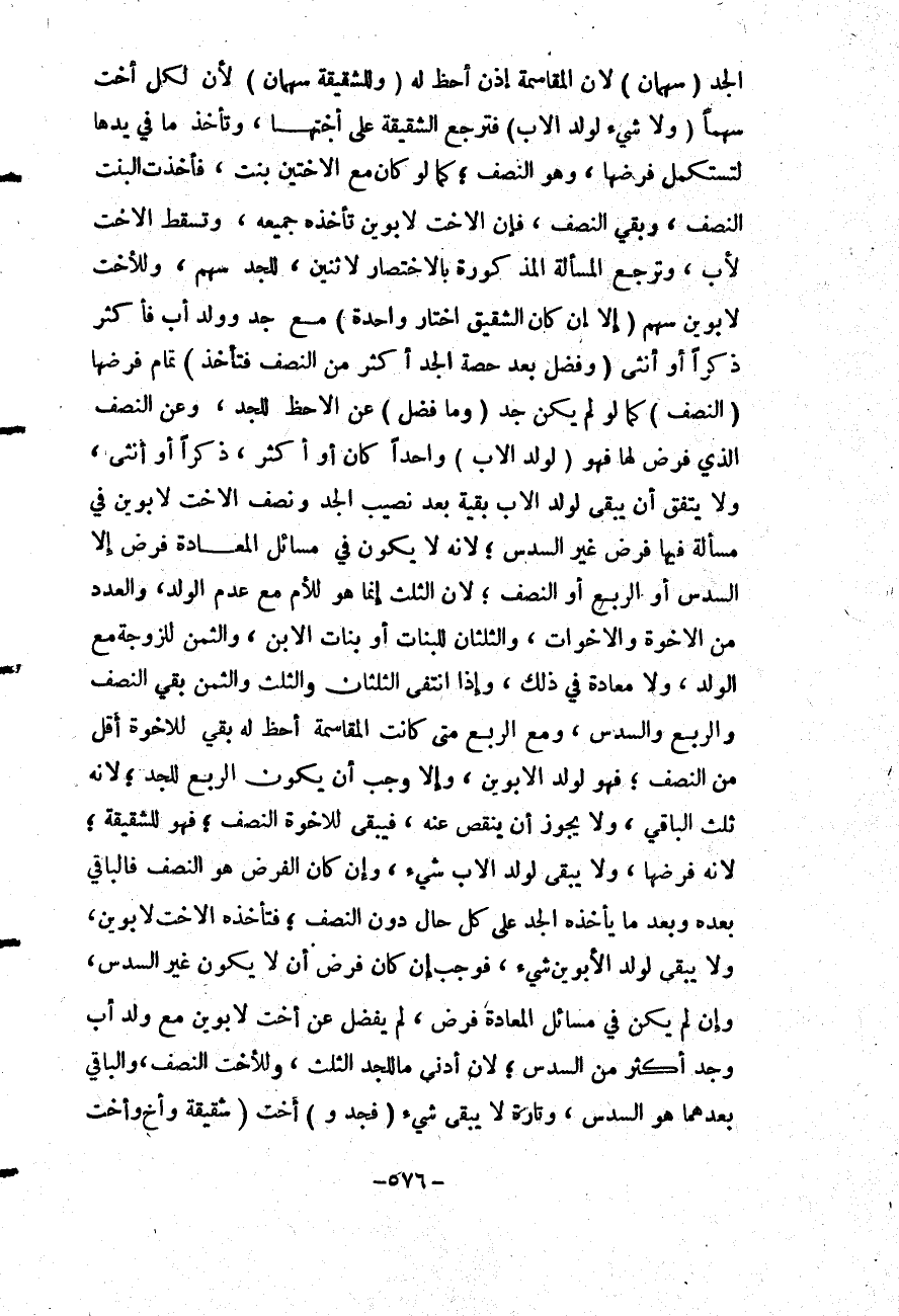 الْجَدِّ (سَهْمَانِ) لِأَنَّ الْمُقَاسَمَةَ إذَنْ أَحَظُّ لَهُ (وَلِلشَّقِيقَةِ سَهْمَانِ) لِأَنَّ لِكُلِّ أُخْتٍ سَهْمًا (وَلَا شَيْءَ لِوَلَدِ الْأَبِ) فَتَرْجِعُ الشَّقِيقَةُ عَلَى أُخْتِهَا، وَتَأْخُذُ مَا فِي يَدِهَا لِتَسْتَكْمِلَ فَرْضَهَا، وَهُوَ النِّصْفُ؛ كَمَا لَوْ كَانَ مَعَ الْأُخْتَيْنِ بِنْتٌ، فَأَخَذَتْ الْبِنْتُ النِّصْفَ، وَبَقِيَ النِّصْفُ، فَإِنَّ الْأُخْتَ لِأَبَوَيْنِ تَأْخُذُهُ جَمِيعَهُ، وَتَسْقُطُ الْأُخْتُ لِأَبٍ، وَتَرْجِعُ الْمَسْأَلَةُ الْمَذْكُورَةُ بِالِاخْتِصَارِ لِاثْنَيْنِ، لِلْجَدِّ سَهْمٌ، وَلِلْأُخْتِ لِأَبَوَيْنِ سَهْمٌ (إلَّا إنْ كَانَ الشَّقِيقُ اخْتَارَ وَاحِدَةً) مَعَ جَدٍّ وَوَلَدِ أَبٍ فَأَكْثَرَ ذَكَرًا أَوْ أُنْثَى (وَفَضَلَ بَعْدَ حِصَّةِ الْجَدِّ أَكْثَرُ مِنْ النِّصْفِ فَتَأْخُذُ) تَمَامَ فَرْضِهَا (النِّصْفَ) كَمَا لَوْ لَمْ يَكُنْ جَدٌّ (وَمَا فَضَلَ) عَنْ الْأَحَظِّ لِلْجَدِّ، وَعَنْ النِّصْفِ الَّذِي فُرِضَ لَهَا فَهُوَ (لِوَلَدِ الْأَبِ) وَاحِدًا كَانَ أَوْ أَكْثَرَ، ذَكَرًا أَوْ أُنْثَى، وَلَا يَتَّفِقُ أَنْ يَبْقَى لِوَلَدِ الْأَبِ بَقِيَّةٌ بَعْدَ نَصِيبِ الْجَدِّ وَنِصْفُ الْأُخْتِ لِأَبَوَيْنِ فِي مَسْأَلَةٍ فِيهَا فَرْضٌ غَيْرُ السُّدُسِ؛ لِأَنَّهُ لَا يَكُونُ فِي مَسَائِلِ الْمُعَادَّةِ فَرْضٌ إلَّا السُّدُسَ أَوْ الرُّبْعَ أَوْ النِّصْفَ؛ لِأَنَّ الثُّلُثَ إنَّمَا هُوَ لِلْأُمِّ مَعَ عَدَمِ الْوَلَدِ، وَالْعَدَدُ مِنْ الْإِخْوَةِ وَالْأَخَوَاتِ، وَالثُّلُثَانِ لِلْبَنَاتِ أَوْ بَنَاتِ الِابْنِ، وَالثُّمُنُ لِلزَّوْجَةِ مَعَ الْوَلَدِ، وَلَا مُعَادَّةَ فِي ذَلِكَ، وَإِذَا انْتَفَى الثُّلُثَانِ وَالثُّلُثُ وَالثُّمُنُ بَقِيَ النِّصْفُ وَالرُّبْعُ وَالسُّدُسُ، وَمَعَ الرُّبْعِ مَتَى كَانَتْ الْمُقَاسَمَةُ أَحَظَّ لَهُ بَقِيَ لِلْإِخْوَةِ أَقَلُّ مِنْ النِّصْفِ؛ فَهُوَ لِوَلَدِ الْأَبَوَيْنِ، وَإِلَّا وَجَبَ أَنْ يَكُونَ الرُّبْعُ لِلْجَدِّ؛ لِأَنَّهُ ثُلُثُ الْبَاقِي، وَلَا يَجُوزُ أَنْ يَنْقُصَ عَنْهُ، فَيَبْقَى لِلْإِخْوَةِ النِّصْفُ؛ فَهُوَ لِلشَّقِيقَةِ؛ لِأَنَّهُ فَرْضُهَا، وَلَا يَبْقَى لِوَلَدِ الْأَبِ شَيْءٌ، وَإِنْ كَانَ الْفَرْضُ هُوَ النِّصْفُ فَالْبَاقِي بَعْدَهُ وَبَعْدَ مَا يَأْخُذُهُ الْجَدُّ عَلَى كُلِّ حَالٍ دُونَ النِّصْفِ؛ فَتَأْخُذُهُ الْأُخْتُ لِأَبَوَيْنِ، وَلَا يَبْقَى لِوَلَدِ الْأَبَوَيْنِ شَيْءٌ، فَوَجَبَ إنْ كَانَ فَرْضٌ أَنْ لَا يَكُونَ غَيْرَ السُّدُسِ، وَإِنْ لَمْ يَكُنْ فِي مَسَائِلِ الْمُعَادَةِ فَرْضٌ، لَمْ يَفْضُلْ عَنْ أُخْتٍ لِأَبَوَيْنِ مَعَ وَلَدِ أَبٍ وَجَدٍّ أَكْثَرُ مِنْ السُّدُسِ؛ لِأَنَّ أَدْنَى مَا لِلْجَدِّ الثُّلُثُ، وَلِلْأُخْتِ النِّصْفُ، وَالْبَاقِي بَعْدَهُمَا هُوَ السُّدُسُ، وَتَارَةً لَا يَبْقَى شَيْءٌ (فَجَدٌّ وَ) أُخْتٌ (شَقِيقَةٌ وَأَخٌ وَأُخْتٌ