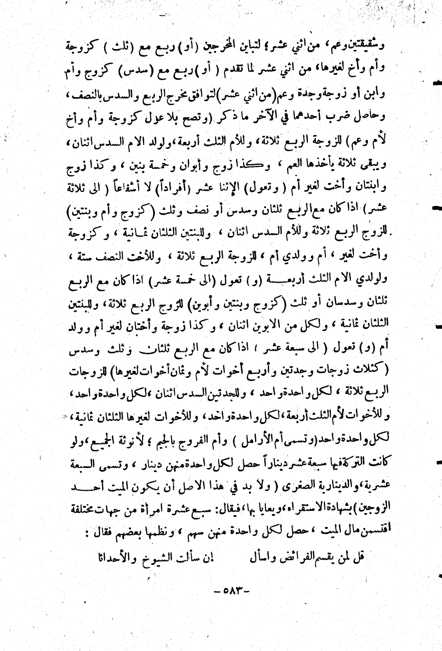 قُلْ لِمَنْ يَقْسِمُ الْفَرَائِضَ وَاسْأَلْ ... إنْ سَأَلَتْ الشُّيُوخَ وَالْأَحْدَاثَا