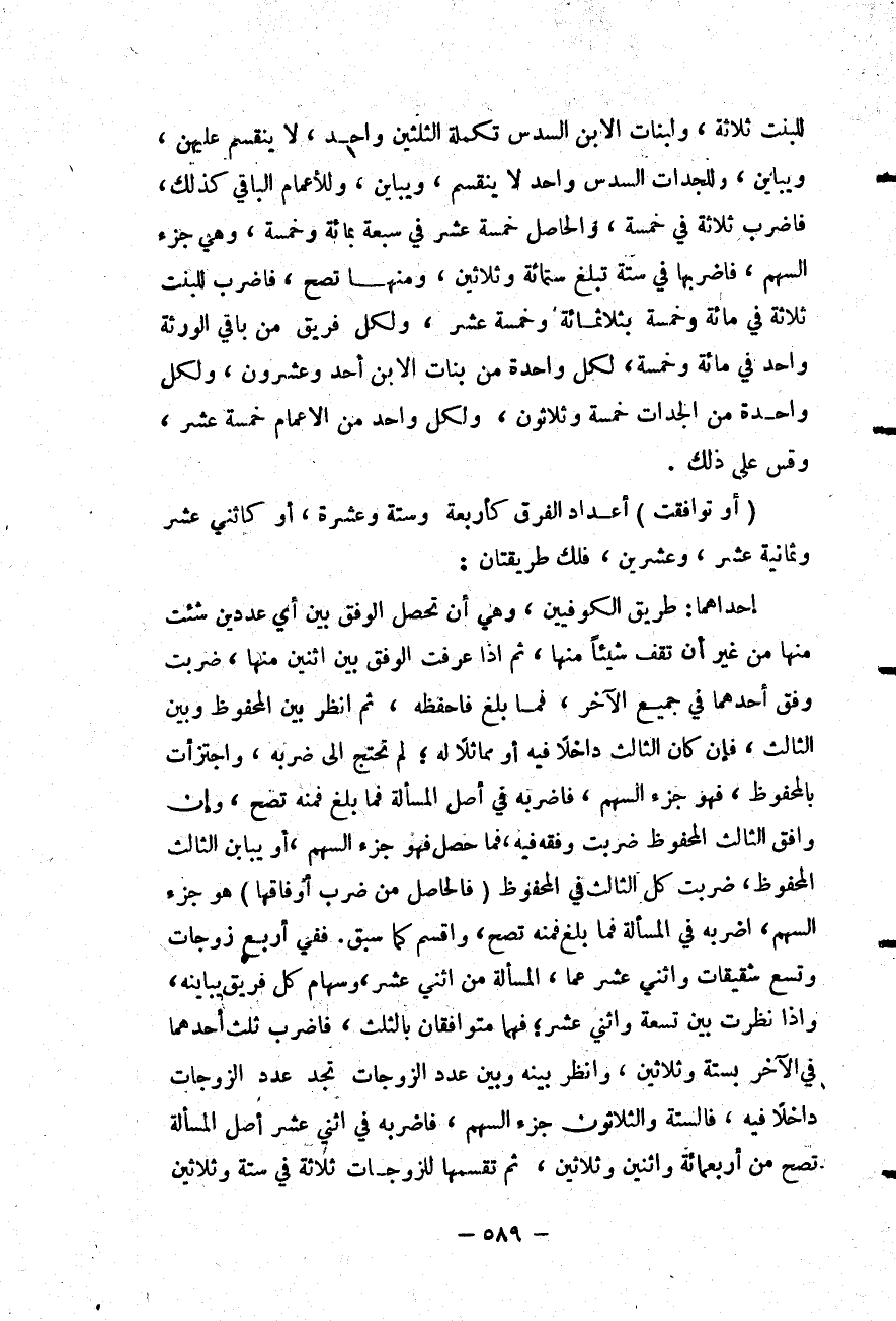 (أَوْ تَوَافَقَتْ) أَعْدَادُ الْفِرَقِ كَأَرْبَعَةٍ وَسِتَّةٍ وَعَشْرَةٍ، أَوْ كَاثْنَيْ عَشَرَ وَثَمَانِيَةَ عَشَرَ، وَعِشْرِينَ، فَلَكَ طَرِيقَتَانِ: إحْدَاهُمَا: طَرِيقُ الْكُوفِيِّينَ، وَهِيَ أَنْ تُحَصِّلَ الْوَفْقَ بَيْنَ أَيِّ عَدَدَيْنِ شِئْتَ مِنْهَا مِنْ غَيْرِ أَنْ تَقِفَ شَيْئًا مِنْهَا، ثُمَّ إذَا عَرَفْتَ الْوَفْقَ بَيْنَ اثْنَيْنِ مِنْهَا، ضَرَبْتَ وَفْقَ أَحَدِهِمَا فِي جَمِيعِ الْآخَرِ، فَمَا بَلَغَ فَاحْفَظْهُ، ثُمَّ اُنْظُرْ بَيْنَ الْمَحْفُوظِ وَبَيْنَ الثَّالِثِ، فَإِنْ كَانَ الثَّالِثُ دَاخِلًا فِيهِ أَوْ مُمَاثِلًا لَهُ؛ لَمْ تَحْتَجْ إلَى ضَرْبِهِ، وَاجْتَزَأْتَ بِالْمَحْفُوظِ، فَهُوَ جُزْءُ السَّهْمِ، فَاضْرِبْهُ فِي أَصْلِ الْمَسْأَلَةِ فَمَا بَلَغَ فَمِنْهُ تَصِحُّ، وَإِنْ وَافَقَ الثَّالِثُ الْمَحْفُوظَ ضَرَبْتَ وَفْقَهُ فِيهِ، فَمَا حَصَلَ فَهُوَ جُزْءُ السَّهْمِ، أَوْ يُبَايِنُ الثَّالِثُ الْمَحْفُوظَ، ضَرَبْتَ كُلَّ الثَّالِثِ فِي الْمَحْفُوظِ (فَالْحَاصِلُ مِنْ ضَرْبِ أَوْفَاقِهَا) هُوَ جُزْءُ السَّهْمِ، اضْرِبْهُ فِي الْمَسْأَلَةِ فَمَا بَلَغَ فَمِنْهُ تَصِحُّ، وَاقْسِمْ كَمَا سَبَقَ.