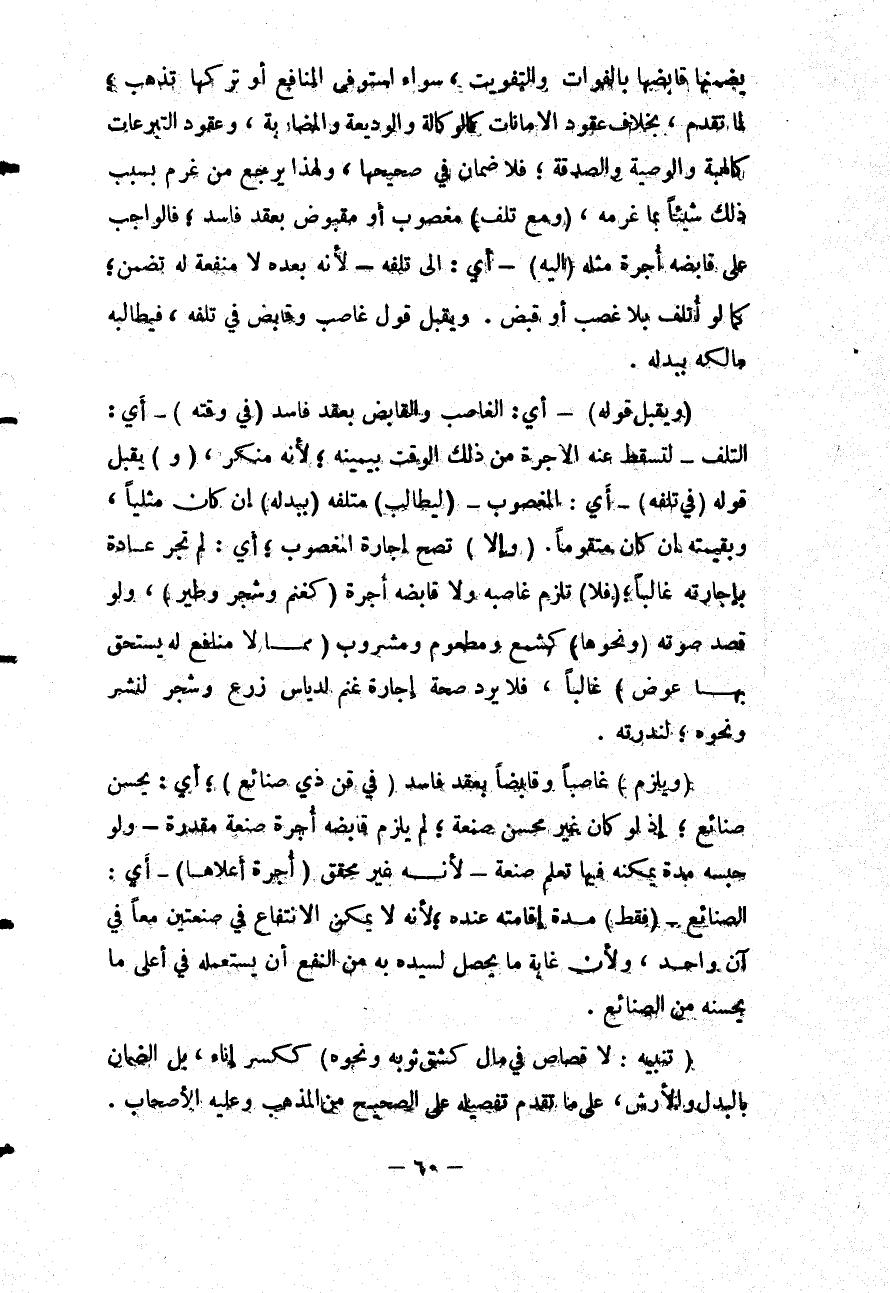 (وَيَلْزَمُ) غَاصِبًا وَقَابِضًا بِعَقْدٍ فَاسِدٍ (فِي قِنٍّ ذِي صَنَائِعَ) ؛ أَيْ: يُحْسِنُ صَنَائِعَ؛ إذْ لَوْ كَانَ غَيْرَ مُحْسِنٍ صَنْعَةً؛ لَمْ يَلْزَمْ قَابِضَهُ أُجْرَةُ صَنْعَةٍ مُقَدَّرَةٍ - وَلَوْ حَبَسَهُ مُدَّةً يُمْكِنُهُ فِيهَا تَعَلُّمُ صَنْعَةٍ - لِأَنَّهُ غَيْرُ مُحَقَّقٍ (أُجْرَةَ أَعْلَاهَا) - أَيْ: الصَّنَائِعِ - (فَقَطْ) مُدَّةَ إقَامَتِهِ عِنْدَهُ؛ لِأَنَّهُ لَا يُمْكِنُ الِانْتِفَاعُ فِي صَنْعَتَيْنِ مَعًا فِي آنٍ وَاحِدٍ، وَلِأَنَّ غَايَةَ مَا يَحْصُلُ لِسَيِّدِهِ بِهِ مِنْ النَّفْعِ أَنْ يَسْتَعْمِلَهُ فِي أَعْلَى مَا يُحْسِنُهُ مِنْ الصَّنَائِعِ.