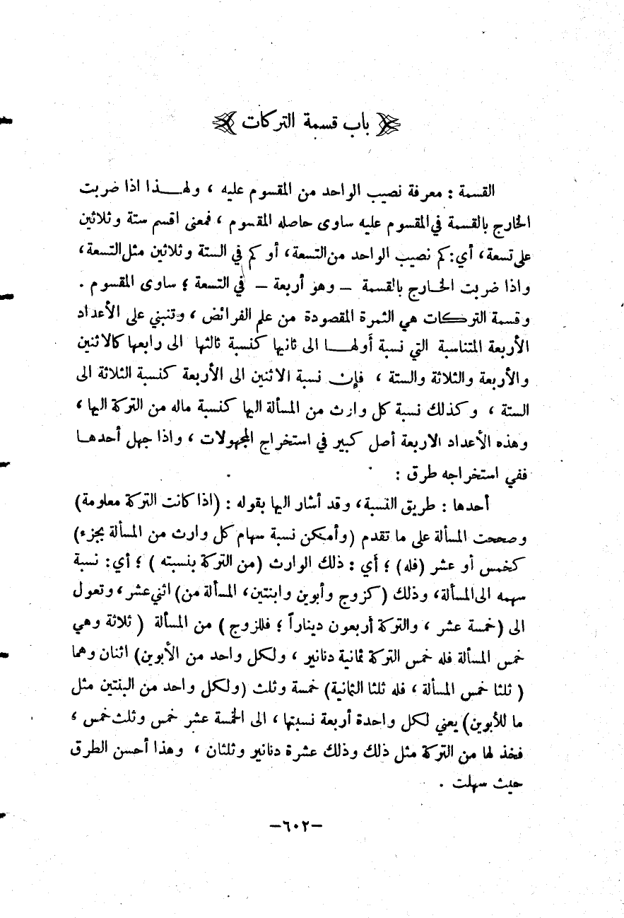 (بَابُ قِسْمَةِ التَّرِكَاتِ) الْقِسْمَةُ: مَعْرِفَةُ نَصِيبِ الْوَاحِدِ مِنْ الْمَقْسُومِ عَلَيْهِ، وَلِهَذَا إذَا ضَرَبْتَ الْخَارِجَ بِالْقِسْمَةِ فِي الْمَقْسُومِ عَلَيْهِ سَاوَى حَاصِلُهُ الْمَقْسُومَ، فَمَعْنَى اقْسِمْ سِتَّةً وَثَلَاثِينَ عَلَى تِسْعَةٍ، أَيْ: كَمْ نَصِيبُ الْوَاحِدِ مِنْ التِّسْعَةِ، أَوْ كَمْ فِي السِّتَّةِ وَثَلَاثِينَ مِثْلُ التِّسْعَةِ، وَاذَا ضَرَبْتَ الْخَارِجَ بِالْقِسْمَةِ - وَهُوَ أَرْبَعَةٌ - فِي التِّسْعَةِ؛ سَاوَى الْمَقْسُومَ.