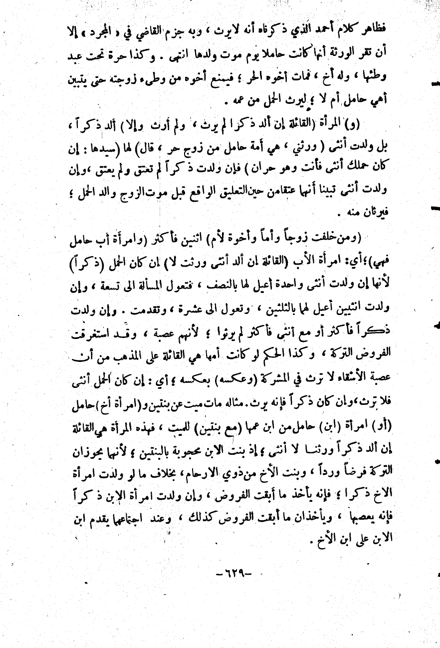 مِثَالُهُ مَاتَ مَيِّتٌ عَنْ بِنْتَيْنِ وَ (امْرَأَةِ أَخٍ) حَامِلٍ (أَوْ) امْرَأَةِ (ابْنٍ) حَامِلٍ مِنْ ابْنِ عَمِّهَا (مَعَ بِنْتَيْنِ) لِلْمَيِّتِ، فَهَذِهِ الْمَرْأَةُ هِيَ الْقَائِلَةُ إنْ أَلِدُ ذَكَرًا وَرِثَنَا لَا أُنْثَى؛ إذْ بِنْتُ الِابْنِ مَحْجُوبَةٌ بِالْبِنْتَيْنِ؛ لِأَنَّهُمَا يَحُوزَانِ التَّرِكَةَ فَرْضًا وَرَدًّا، وَبِنْتُ الْأَخِ مِنْ ذَوِي الْأَرْحَامِ، بِخِلَافِ مَا لَوْ وَلَدَتْ امْرَأَةُ الْأَخِ ذَكَرًا؛ فَإِنَّهُ يَأْخُذُ مَا أَبْقَتْ الْفُرُوضُ، وَإِنْ وَلَدَتْ امْرَأَةُ الِابْنِ ذَكَرًا فَإِنَّهُ يُعَصِّبُهَا، وَيَأْخُذَانِ مَا أَبْقَتْ الْفُرُوضُ كَذَلِكَ، وَعِنْدَ اجْتِمَاعِهِمَا يُقَدَّمُ ابْنُ الِابْنِ عَلَى ابْنِ الْأَخِ.