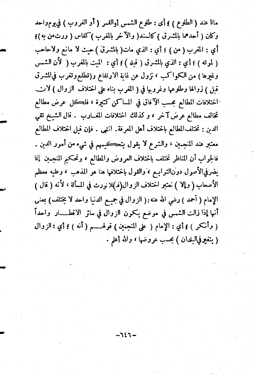فَإِنْ قِيلَ اخْتِلَافُ الْمَطَالِعِ مُعْتَبَرٌ عِنْدَ الْمُنَجِّمِينَ، وَالشَّرْعُ لَا يَقُولُ بِتَحْكِيمِهِمْ فِي شَيْءٍ مِنْ أُمُورِ الدِّينِ. فَالْجَوَابُ أَنَّ الْمَنَاظِرَ تَخْتَلِفُ بِاخْتِلَافِ الْعُرُوضِ وَالْمَطَالِعِ، وَتَحْكِيمُ الْمُنَجِّمِينَ إنَّمَا يَضُرُّ فِي الْأُصُولِ دُونَ التَّوَابِعِ، وَالْقَوْلُ بِاخْتِلَافِهَا هُنَا هُوَ الْمَذْهَبُ، وَعَلَيْهِ مُعْظَمُ الْأَصْحَابِ (وَإِلَّا) نَعْتَبِرْ اخْتِلَافَ الزَّوَالِ (فَ) لَا نُوَرِّثُ فِي الْمَسْأَلَةِ؛ لِأَنَّهُ (قَالَ) الْإِمَامُ (أَحْمَدُ) - رَضِيَ اللَّهُ عَنْهُ -: (الزَّوَالُ فِي جَمِيعِ الدُّنْيَا وَاحِدٌ لَا يَخْتَلِفُ) بِمَعْنَى أَنَّهَا إذَا زَالَتْ الشَّمْسُ فِي مَوْضِعٍ يَكُونُ الزَّوَالُ فِي سَائِرِ الْأَقْطَارِ وَاحِدًا (وَأَنْكَرَ) ؛ أَيْ: الْإِمَامُ (عَلَى الْمُنَجِّمِينَ) قَوْلَهُمْ (أَنَّهُ) ؛ أَيْ: الزَّوَالَ (يَتَغَيَّرُ فِي الْبُلْدَانِ) بِحَسَبِ عُرُوضِهَا، وَاَللَّهُ أَعْلَمُ.