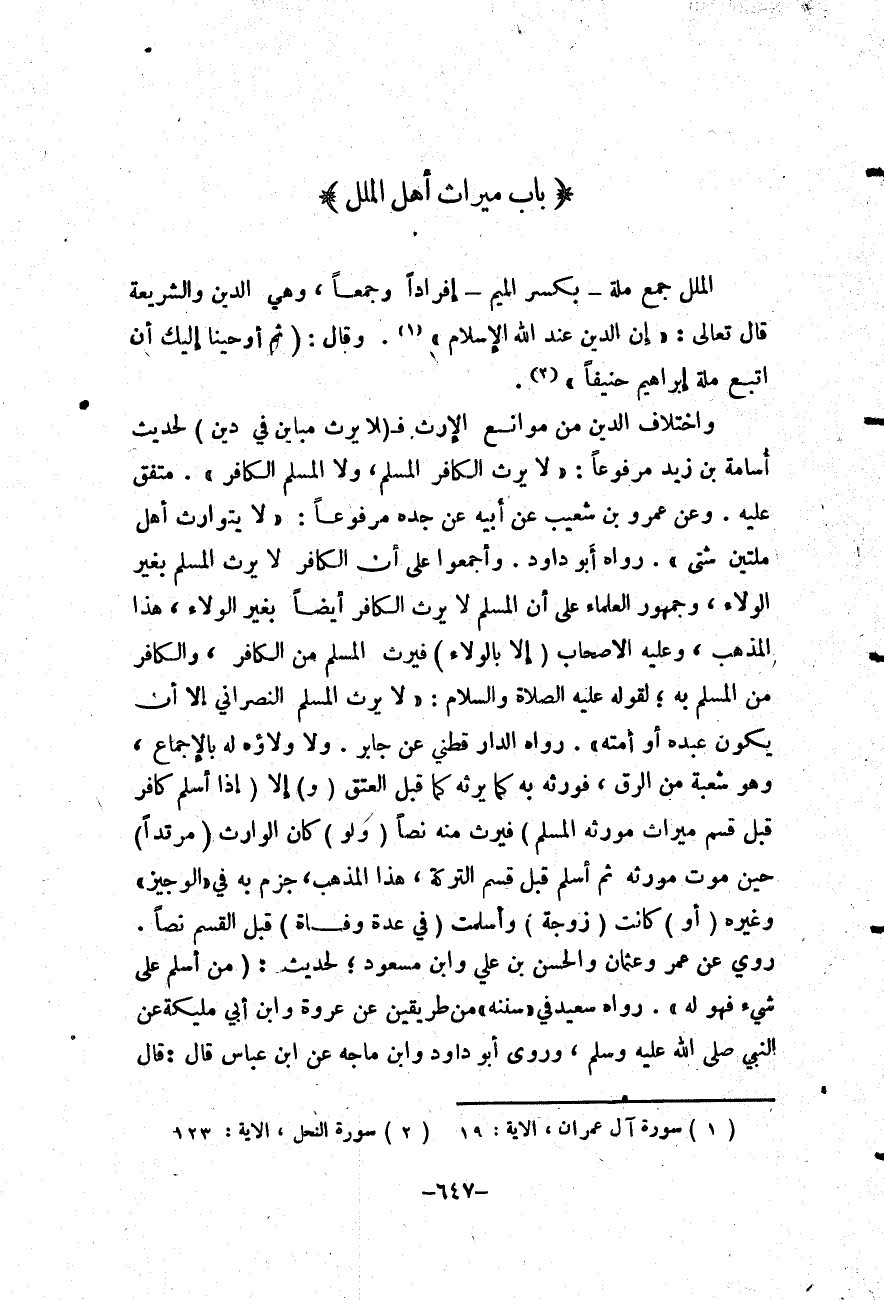 (بَابُ مِيرَاثِ أَهْلِ الْمِلَلِ) الْمِلَلُ جَمْعُ مِلَّةٍ - بِكَسْرِ الْمِيمِ - إفْرَادًا وَجَمْعًا، وَهِيَ الدِّينُ وَالشَّرِيعَةُ قَالَ تَعَالَى: {إِنَّ الدِّينَ عِنْدَ اللَّهِ الإِسْلامُ} [آل عمران: 19] . وَقَالَ: {ثُمَّ أَوْحَيْنَا إِلَيْكَ أَنِ اتَّبِعْ مِلَّةَ إِبْرَاهِيمَ حَنِيفًا} [النحل: 123] .