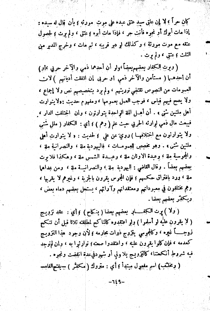 أَنَّ أَهْلَ الْمِلَّةِ الْوَاحِدَةِ يَتَوَارَثُونَ، وَإِنْ اخْتَلَفَتْ الدَّارُ، فَيُبْعَثُ مَالُ ذِمِّيٍّ لِوَارِثِهِ الْحَرْبِيِّ حَيْثُ عُلِمَ (وَهُمْ) ؛ أَيْ: الْكُفَّارُ (مِلَلٌ شَتَّى وَلَا يَتَوَارَثُونَ مَعَ اخْتِلَافِهَا) رُوِيَ عَنْ عَلِيٍّ؛ لِحَدِيثِ: «لَا يَتَوَارَثُ أَهْلُ مِلَّتَيْنِ شَتَّى» .