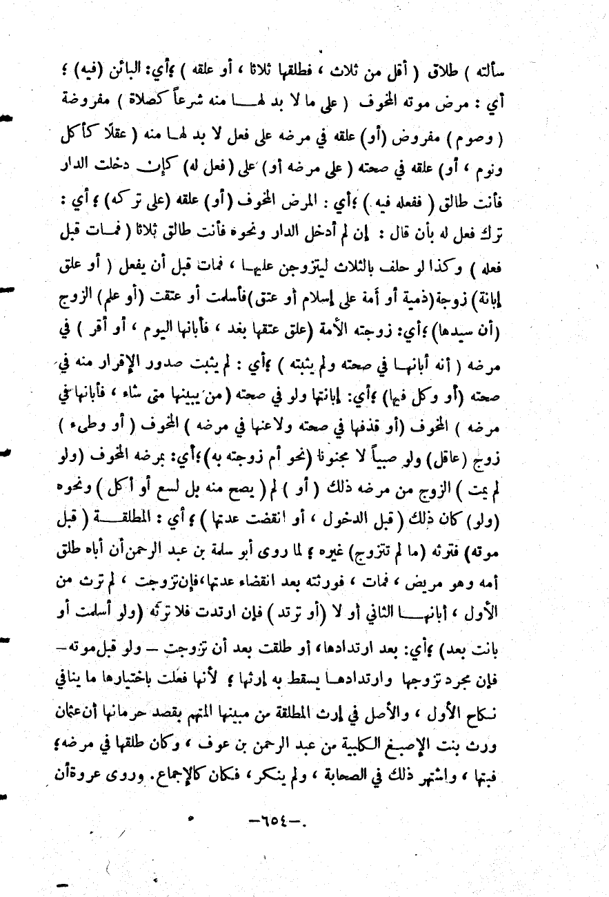 سَأَلَتْهُ) طَلَاقَ (أَقَلِّ مِنْ ثَلَاثٍ، فَطَلَّقَهَا ثَلَاثًا، أَوْ عَلَّقَهُ) ؛ أَيْ: الْبَائِنَ (فِيهِ) ؛ أَيْ: مَرَضِ مَوْتِهِ الْمَخُوفِ (عَلَى مَا لَا بُدّ لَهَا مِنْهُ شَرْعًا كَصَلَاةٍ) مَفْرُوضَةٍ (وَصَوْمٍ) مَفْرُوضٍ (أَوْ) عَلَّقَهُ فِي مَرَضِهِ عَلَى فِعْلٍ لَا بُدَّ لَهَا مِنْهُ (عَقْلًا كَأَكْلٍ وَنَوْمٍ، أَوْ) عَلَّقَهُ فِي صِحَّتِهِ (عَلَى مَرَضِهِ أَوْ) عَلَى (فِعْلٍ لَهُ) كَإِنْ دَخَلْتِ الدَّارَ فَأَنْتِ طَالِقٌ (فَفَعَلَهُ فِيهِ) ؛ أَيْ: الْمَرَضِ الْمَخُوفِ (أَوْ) عَلَّقَهُ (عَلَى تَرْكِهِ) ؛ أَيْ: تَرْكِ فِعْلٍ لَهُ بِأَنْ قَالَ: إنْ لَمْ أَدْخُلْ الدَّارَ وَنَحْوَهُ فَأَنْتِ طَالِقٌ ثَلَاثًا (فَمَاتَ قَبْلَ فِعْلِهِ) وَكَذَا لَوْ حَلَفَ بِالثَّلَاثِ لَيَتَزَوَّجَنَّ عَلَيْهَا، فَمَاتَ قَبْلَ أَنْ يَفْعَلَ (أَوْ عَلَّقَ إبَانَةَ) زَوْجَةٍ (ذِمِّيَّةٍ أَوْ أَمَةٍ عَلَى إسْلَامٍ أَوْ عِتْقٍ) فَأَسْلَمَتْ أَوْ عَتَقَتْ (أَوْ عَلِمَ) الزَّوْجُ (أَنَّ سَيِّدَهَا) ؛ أَيْ: زَوْجَتِهِ الْأَمَةِ (عَلَّقَ عِتْقَهَا بِغَدٍ، فَأَبَانَهَا الْيَوْمَ، أَوْ أَقَرَّ) فِي مَرَضِهِ (أَنَّهُ أَبَانَهَا فِي صِحَّتِهِ وَلَمْ يُثْبِتْهُ) ؛ أَيْ: لَمْ يُثْبِتْ صُدُورَ الْإِقْرَارِ مِنْهُ فِي صِحَّتِهِ (أَوْ وَكَّلَ فِيهَا) ؛ أَيْ: إبَانَتِهَا وَلَوْ فِي صِحَّتِهِ (مَنْ يُبَيِّنُهَا مَتَى شَاءَ، فَأَبَانَهَا فِي مَرَضِهِ) الْمَخُوفِ (أَوْ قَذَفَهَا فِي صِحَّتِهِ وَلَاعَنَهَا فِي مَرَضِهِ) الْمَخُوفِ (أَوْ وَطِئَ) زَوْجٌ (عَاقِلٌ) وَلَوْ صَبِيًّا لَا مَجْنُونًا (نَحْوَ أُمِّ زَوْجَتِهِ بِهِ) ؛ أَيْ: بِمَرَضِهِ الْمَخُوفِ (وَلَوْ لَمْ يَمُتْ) الزَّوْجُ مِنْ مَرَضِهِ ذَلِكَ (أَوْ) لَمْ (يَصِحَّ مِنْهُ بَلْ لَسْعٌ أَوْ أَكْلٌ) وَنَحْوُهُ (وَلَوْ) كَانَ ذَلِكَ (قَبْلَ الدُّخُولِ، أَوْ انْقَضَتْ عِدَّتُهَا) ؛ أَيْ: الْمُطَلَّقَةِ (قَبْلَ مَوْتِهِ) فَتَرِثُهُ (مَا لَمْ تَتَزَوَّجْ) غَيْرَهُ؛ لِمَا رَوَى أَبُو سَلَمَةَ بْنُ عَبْدِ الرَّحْمَنِ أَنَّ أَبَاهُ طَلَّقَ أُمَّهُ وَهُوَ مَرِيضٌ، فَمَاتَ فَوَرِثَتْهُ بَعْدَ انْقِضَاءِ عِدَّتِهَا، فَإِنْ تَزَوَّجَتْ، لَمْ تَرِثْ مِنْ الْأَوَّلِ، أَبَانَهَا الثَّانِي أَوْ لَا (أَوْ تَرْتَدَّ) فَإِنْ ارْتَدَّتْ فَلَا تَرِثُهُ (وَلَوْ أَسْلَمَتْ أَوْ بَانَتْ بَعْدُ) ؛ أَيْ: بَعْدَ ارْتِدَادِهَا، أَوْ طَلُقَتْ بَعْدَ أَنْ تَزَوَّجَتْ - وَلَوْ قَبْلَ مَوْتِهِ - فَإِنَّ مُجَرَّدَ تَزَوُّجِهَا وَارْتِدَادِهَا يَسْقُطُ بِهِ إرْثُهَا؛؛ لِأَنَّهَا فَعَلَتْ بِاخْتِيَارِهَا مَا يُنَافِي نِكَاحَ الْأَوَّلِ، وَالْأَصْلُ فِي إرْثِ الْمُطَلَّقَةِ مِنْ مُبِينِهَا الْمُتَّهَمِ بِقَصْدِ حِرْمَانِهَا أَنَّ عُثْمَانَ وَرَّثَ بِنْتَ الْأَصْبَغِ الْكَلْبِيَّةِ مِنْ عَبْدِ الرَّحْمَنِ بْنِ عَوْفٍ، وَكَانَ طَلَّقَهَا فِي مَرَضِهِ؛ فَبَتَّهَا، وَاشْتُهِرَ ذَلِكَ فِي الصَّحَابَةِ، وَلَمْ يُنْكَرْ، فَكَانَ كَالْإِجْمَاعِ.
