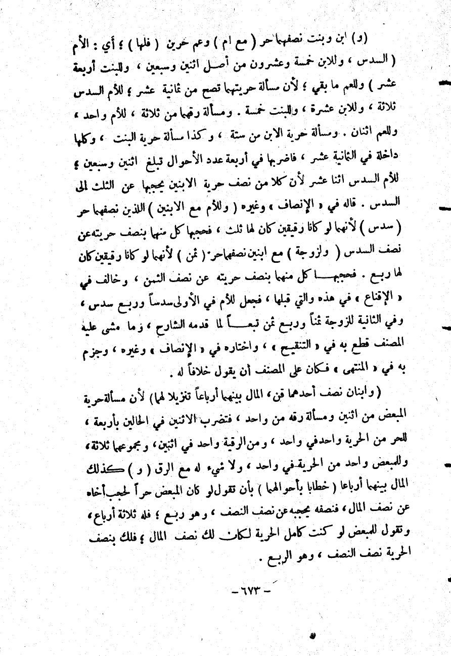 قَالَهُ فِي " الْإِنْصَافِ " وَغَيْرِهِ (وَلِلْأُمِّ مَعَ الِابْنَيْنِ) اللَّذَيْنِ نِصْفُهُمَا حُرٌّ (سُدُسٌ) ؛ لِأَنَّهُمَا لَوْ كَانَا رَقِيقَيْنِ كَانَ لَهَا ثُلُثٌ، فَحَجَبَهَا كُلٌّ مِنْهُمَا بِنِصْفِ حُرِّيَّتِهِ عَنْ نِصْفِ السُّدُسِ (وَلِزَوْجَةٍ) مَعَ ابْنَيْنِ نِصْفُهُمَا حُرٌّ (ثُمُنٌ) ؛ لِأَنَّهُمَا لَوْ كَانَا رَقِيقَيْنِ كَانَ لَهَا رُبْعٌ. فَحَجَبَهَا كُلٌّ مِنْهُمَا بِنِصْفِ حُرِّيَّتِهِ عَنْ نِصْفِ الثُّمُنِ، وَخَالَفَ فِي " الْإِقْنَاعِ " فِي هَذِهِ وَاَلَّتِي قَبْلَهَا، فَجَعَلَ لِلْأُمِّ فِي الْأُولَى سُدُسًا وَرُبْعَ سُدُسٍ، وَفِي الثَّانِيَةِ لِلزَّوْجَةِ ثُمُنًا وَرُبْعَ ثُمُنٍ تَبَعًا لِمَا قَدَّمَهُ الشَّارِحُ، وَمَا مَشَى عَلَيْهِ الْمُصَنِّفُ قَطَعَ بِهِ فِي " التَّنْقِيحِ "، وَاخْتَارَهُ فِي " الْإِنْصَافِ " وَغَيْرِهِ، وَجَزَمَ بِهِ فِي الْمُنْتَهَى " فَكَانَ عَلَى الْمُصَنِّفِ أَنْ يَقُولَ خِلَافًا لَهُ.