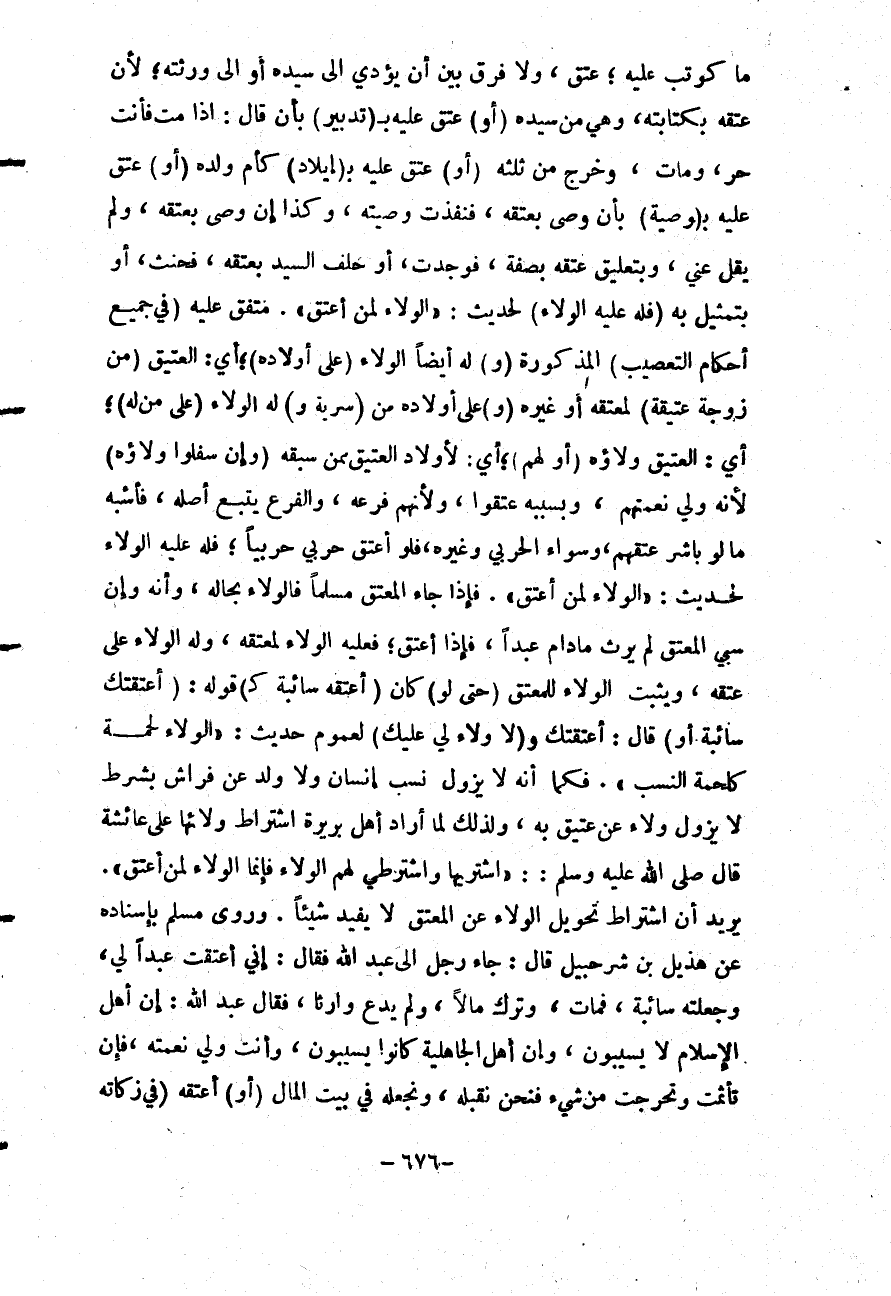 يُرِيدُ أَنَّ اشْتِرَاطَ تَحْوِيلِ الْوَلَاءِ عَنْ الْمُعْتَقِ لَا يُفِيدُ شَيْئًا. وَرَوَى مُسْلِمٌ بِإِسْنَادِهِ عَنْ هُذَيْلِ بْنِ شُرَحْبِيلَ قَالَ: جَاءَ رَجُلٌ إلَى عَبْدِ اللَّهِ فَقَالَ: إنِّي أَعْتَقْت عَبْدًا لِي، وَجَعَلْته سَائِبَةً، فَمَاتَ، وَتَرَكَ مَالًا، وَلَمْ يَدَعْ وَارِثًا، فَقَالَ عَبْدُ اللَّهِ: إنَّ أَهْلَ الْإِسْلَامِ لَا يُسَيِّبُونَ، وَإِنَّ أَهْلَ الْجَاهِلِيَّةِ كَانُوا يُسَيِّبُونَ، وَأَنْتَ وَلِيُّ نِعْمَتِهِ، فَإِنْ تَأَثَّمْت وَتَحَرَّجْتَ مِنْ شَيْءٍ فَنَحْنُ نَقْبَلُهُ، وَنَجْعَلُهُ فِي بَيْتِ الْمَالِ (أَوْ) أَعْتَقَهُ (فِي زَكَاتِهِ