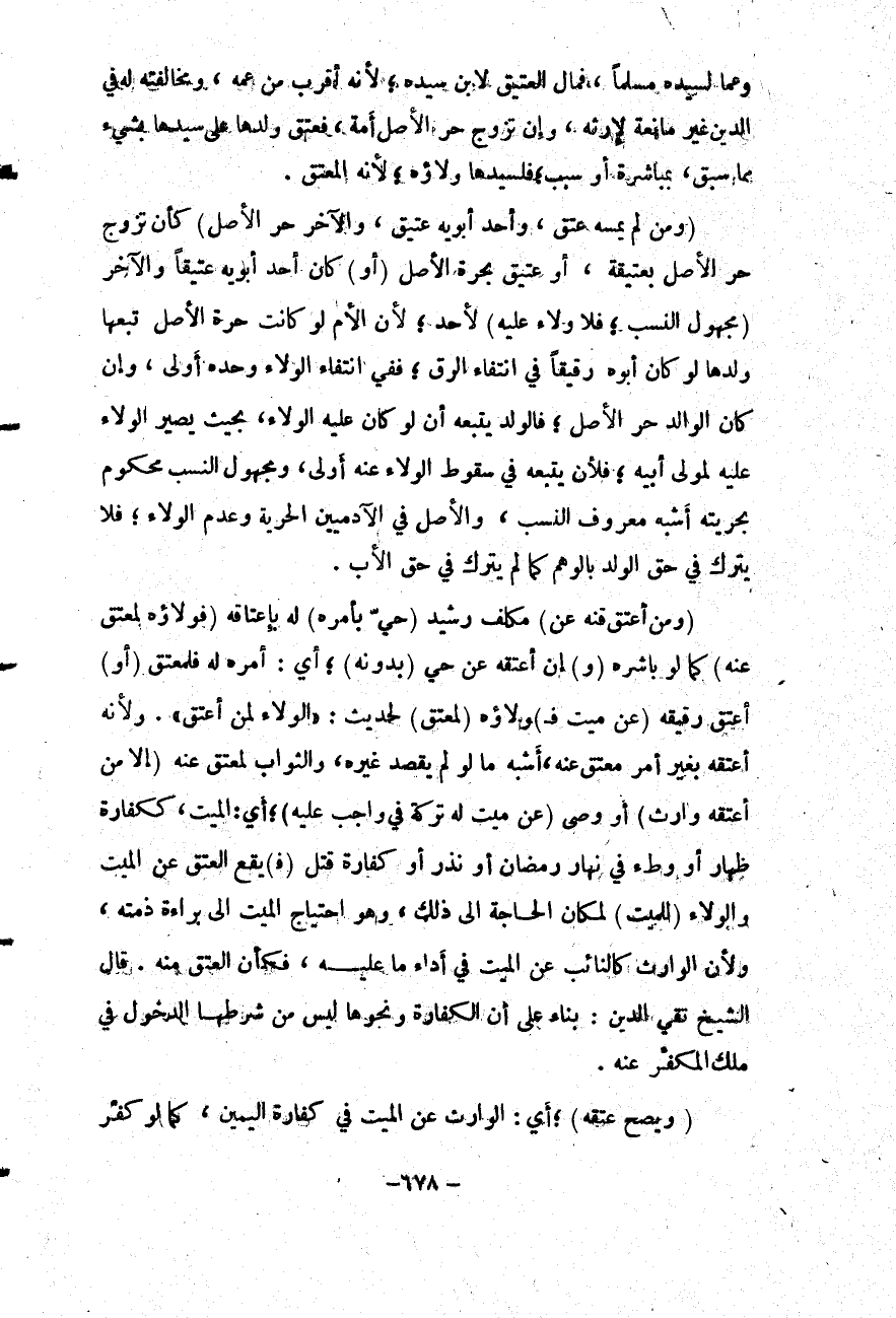 قَالَ الشَّيْخُ تَقِيُّ الدِّينِ: بِنَاءً عَلَى أَنَّ الْكَفَّارَةَ وَنَحْوَهَا لَيْسَ مِنْ شَرْطِهَا الدُّخُولُ فِي مِلْكِ الْمُكَفَّرِ عَنْهُ.