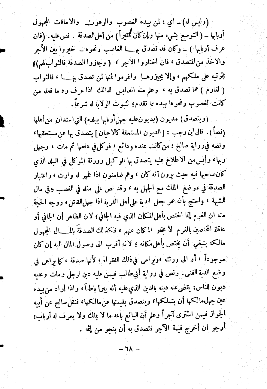 قَالَ ابْنُ رَجَبٍ: [الدُّيُونُ الْمُسْتَحَقَّةُ كَالْأَعْيَانِ] يَتَصَدَّقُ بِهَا عَنْ مُسْتَحَقِّيهَا، وَنَصُّهُ فِي رِوَايَةِ صَالِحٍ: مَنْ كَانَتْ عِنْدَهُ وَدَائِعُ، فَوَكَّلَ فِي دَفْعِهَا ثُمَّ مَاتَ، وَجُهِلَ رَبُّهَا، وَأَيِسَ مِنْ الْإِطْلَاعِ عَلَيْهِ يَتَصَدَّقُ بِهَا الْوَكِيلُ وَوَرَثَةُ الْمُوَكِّلِ فِي الْبَلَدِ الَّذِي كَانَ صَاحِبُهَا فِيهِ حَيْثُ يَرَوْنَ أَنَّهُ كَانَ، وَهُمْ ضَامِنُونَ إذَا ظَهَرَ لَهُ وَارِثٌ، وَاعْتِبَارُ الصَّدَقَةِ فِي مَوْضِعِ الْمِلْكِ مَعَ الْجَهْلِ بِهِ، وَقَدْ نَصَّ عَلَى مِثْلِهِ فِي الْغَصْبِ وَفِي مَالِ الشُّبْهَةِ، وَاحْتَجَّ بِأَنَّ عُمَرَ جَعَلَ الدِّيَةَ عَلَى أَهْلِ الْقَرْيَةِ إذَا جُهِلَ الْقَاتِلُ، وَوَجْهُ الْحُجَّةِ مِنْهُ أَنَّ الْغُرْمَ إنَّمَا اخْتَصَّ بِأَهْلِ الْمَكَانِ الَّذِي فِيهِ الْجَانِي؛ لِأَنَّ الظَّاهِرَ أَنَّ الْجَانِيَ أَوْ عَاقِلَةَ الْمُخْتَصِّينَ بِالْغُرْمِ لَا يَخْلُو الْمَكَانُ عَنْهُمْ فَكَذَلِكَ الصَّدَقَةُ بِالْمَالِ الْمَجْهُولِ مَالِكُهُ يَنْبَغِي أَنْ يَخْتَصَّ بِأَهْلِ مَكَانِهِ؛ لِأَنَّهُ أَقْرَبُ إلَى وُصُولِ الْمَالِ إلَيْهِ إنْ كَانَ مَوْجُودًا، أَوْ إلَى وَرَثَتِهِ، وَيُرَاعَى فِي ذَلِكَ الْفُقَرَاءُ، لِأَنَّهَا صَدَقَةٌ، كَمَا يُرَاعَى فِي وَضْعِ الدِّيَةِ الْفَتَى.