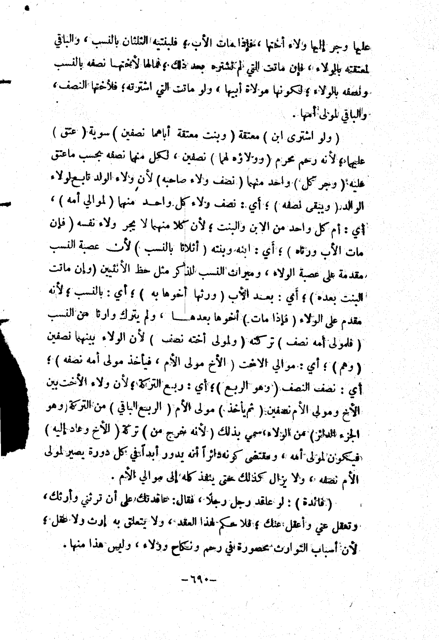 (وَلَوْ اشْتَرَى ابْنُ) مُعْتَقَةٍ (وَبِنْتُ مُعْتَقَةٍ أَبَاهُمَا نِصْفَيْنِ) سَوِيَّةً (عَتَقَ) عَلَيْهِمَا؛ لِأَنَّهُ رَحِمٌ مَحْرَمٌ (وَوَلَاؤُهُ لَهُمَا) نِصْفَيْنِ، لِكُلٍّ مِنْهُمَا نِصْفُهُ بِحَسَبِ مَا عَتَقَ عَلَيْهِ (وَجَرَّ كُلُّ) وَاحِدٍ مِنْهُمَا (نِصْفَ وَلَاءِ صَاحِبِهِ) لِأَنَّ وَلَاءَ الْوَلَدِ تَابِعٌ لِوَلَاءِ الْوَالِدِ (وَيَبْقَى نِصْفُهُ) ؛ أَيْ: نِصْفُ وَلَاءِ كُلِّ وَاحِدٍ مِنْهُمَا (لِمَوَالِي أُمِّهِ) ، أَيْ: أُمِّ كُلِّ وَاحِدٍ مِنْ الِابْنِ وَالْبِنْتِ؛ لِأَنَّ كُلًّا مِنْهُمَا لَا يَجُرُّ وَلَاءَ نَفْسِهِ (فَإِنْ مَاتَ الْأَبُ وَرِثَاهُ) ؛ أَيْ: ابْنُهُ وَبِنْتُهُ (أَثْلَاثًا بِالنَّسَبِ) لِأَنَّ عَصَبَةَ النَّسَبِ مُقَدَّمَةٌ عَلَى عَصَبَةِ الْوَلَاءِ، وَمِيرَاثُ النَّسَبِ لِلذَّكَرِ مِثْلُ حَظِّ الْأُنْثَيَيْنِ (وَإِنْ مَاتَتْ الْبِنْتُ بَعْدَهُ) ؛ أَيْ: بَعْدَ الْأَبِ (وَرِثَهَا أَخُوهَا بِهِ) ؛ أَيْ: بِالنَّسَبِ؛ لِأَنَّهُ مُقَدَّمٌ عَلَى الْوَلَاءِ (فَإِذَا مَاتَ) أَخُوهَا بَعْدَهَا، وَلَمْ يَتْرُكْ وَارِثًا مِنْ النَّسَبِ (فَلِمَوْلَى أُمِّهِ نِصْفُ) تَرِكَتِهِ (وَلِمَوْلَى أُخْتِهِ نِصْفٌ) لِأَنَّ الْوَلَاءَ بَيْنَهُمَا نِصْفَيْنِ (وَهُمْ) ؛ أَيْ: مَوَالِي الْأُخْتِ (الْأَخُ مَوْلَى الْأُمِّ، فَيَأْخُذُ مَوْلَى أُمِّهِ نِصْفَهُ) ؛ أَيْ: نِصْفَ النِّصْفِ (وَهُوَ الرُّبُعُ) ؛ أَيْ: رُبُعُ التَّرِكَةِ؛ لِأَنَّ وَلَاءَ الْأُخْتِ بَيْنَ الْأَخِ وَمَوْلَى الْأُمِّ نِصْفَيْنِ (ثُمَّ يَأْخُذُ) مَوْلَى الْأُمِّ (الرُّبُعَ الْبَاقِي) مِنْ التَّرِكَةِ (وَهُوَ الْجُزْءُ الدَّائِرُ) مِنْ الْوَلَاءِ، سُمِّيَ بِذَلِكَ (لِأَنَّهُ خَرَجَ مِنْ) تَرِكَةِ (الْأَخِ وَعَادَ إلَيْهِ) فَيَكُونُ لِمَوْلَى أُمِّهِ، وَمُقْتَضَى كَوْنِهِ دَائِرًا أَنَّهُ يَدُورُ أَبَدًا فِي كُلِّ دَوْرَةٍ يَصِيرُ لِمَوْلَى الْأُمِّ نِصْفُهُ، وَلَا يَزَالُ كَذَلِكَ حَتَّى يَنْفُذَ كُلُّهُ إلَى مَوَالِي الْأُمِّ.