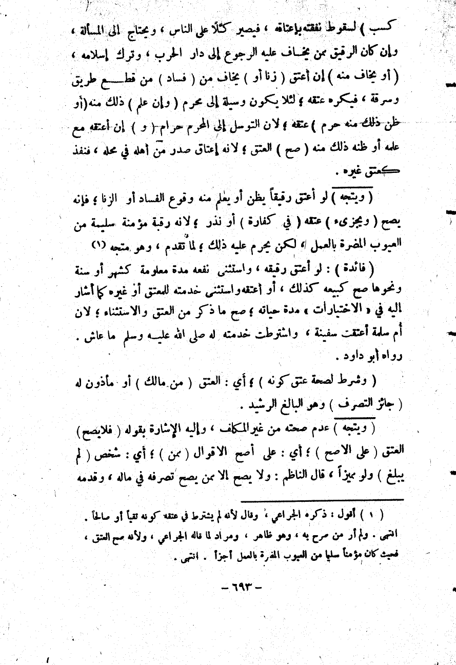 (وَيَتَّجِهُ) لَوْ أَعْتَقَ رَقِيقًا يَظُنُّ أَوْ يَعْلَمُ مِنْهُ وُقُوعَ الْفَسَادِ أَوْ الزِّنَا؛ فَإِنَّهُ يَصِحُّ (وَيُجْزِئُ) عِتْقُهُ (فِي كَفَّارَةٍ) أَوْ نَذْرٍ؛ لِأَنَّهُ رَقَبَةٌ مُؤْمِنَةٌ سَلِيمَةٌ مِنْ الْعُيُوبِ الْمُضِرَّةِ بِالْعَمَلِ، لَكِنْ يَحْرُمُ عَلَيْهِ ذَلِكَ؛ لِمَا تَقَدَّمَ، وَهُوَ مُتَّجِهٌ