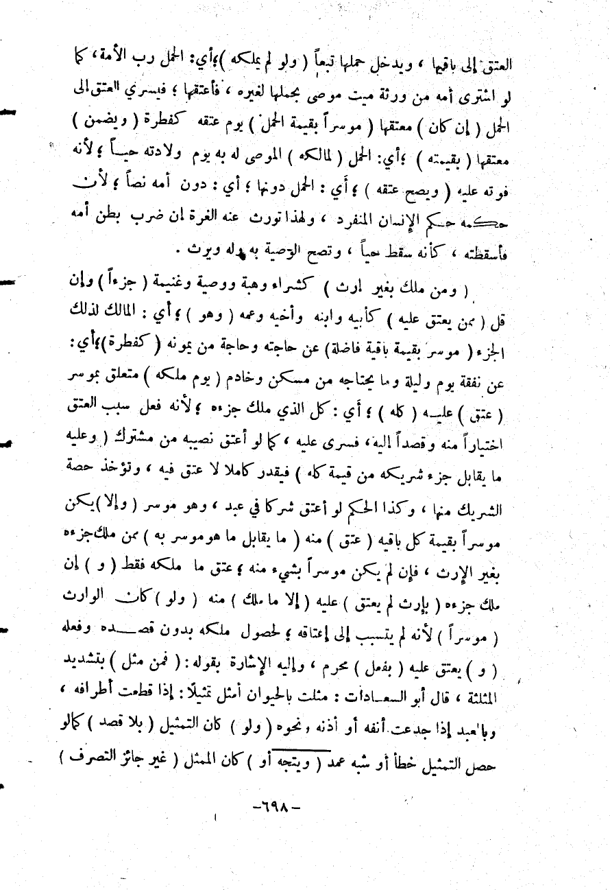 (وَمَنْ مَلَكَ بِغَيْرِ إرْثٍ) كَشِرَاءٍ وَهِبَةٍ وَوَصِيَّةٍ وَغَنِيمَةٍ (جُزْءًا) وَإِنْ قَلَّ (مِمَّنْ يَعْتِقُ عَلَيْهِ) كَأَبِيهِ وَابْنِهِ وَأَخِيهِ وَعَمِّهِ (وَهُوَ) ؛ أَيْ: الْمَالِكُ لِذَلِكَ الْجُزْءِ (مُوسِرٌ بِقِيمَةٍ بَاقِيَةٍ فَاضِلَةٍ) عَنْ حَاجَتِهِ وَحَاجَةِ مَنْ يُمَوِّنُهُ (كَفِطْرَةٍ) ؛ أَيْ: عَنْ نَفَقَةِ يَوْمٍ وَلَيْلَةٍ وَمَا يَحْتَاجُهُ مِنْ مَسْكَنٍ وَخَادِمٍ (يَوْمَ مِلْكِهِ) مُتَعَلِّقٌ بِمُوسِرٍ (عَتَقَ) عَلَيْهِ (كُلُّهُ) ؛ أَيْ: كُلُّ الَّذِي مَلَكَ جُزْأَهُ؛ لِأَنَّهُ فَعَلَ سَبَبَ الْعِتْقِ اخْتِيَارًا مِنْهُ وَقَصْدًا إلَيْهِ، فَسَرَى عَلَيْهِ، كَمَا لَوْ أَعْتَقَ نَصِيبَهُ مِنْ مُشْتَرِكٍ (وَعَلَيْهِ مَا يُقَابِلُ جُزْءَ شَرِيكِهِ مِنْ قِيمَةِ كُلِّهِ) فَيُقَدَّرُ كَامِلًا لَا عِتْقَ فِيهِ، وَتُؤْخَذُ حِصَّةُ الشَّرِيكِ مِنْهَا، وَكَذَا الْحُكْمُ لَوْ أَعْتَقَ شُرُكًا فِي عَبْدٍ، وَهُوَ مُوسِرٌ (وَإِلَّا) يَكُنْ مُوسِرًا بِقِيمَةِ كُلِّ بَاقِيهِ (عَتَقَ) مِنْهُ (مَا يُقَابِلُ مَا هُوَ مُوسِرٌ بِهِ) مِمَّنْ مَلَكَ جُزْأَهُ بِغَيْرِ الْإِرْثِ، فَإِنْ لَمْ يَكُنْ مُوسِرًا بِشَيْءٍ مِنْهُ؛ عَتَقَ مَا مَلَكَهُ فَقَطْ (وَ) إنْ مَلَكَ جُزْأَهُ (بِإِرْثٍ لَمْ يَعْتِقْ) عَلَيْهِ (إلَّا مَا مَلَكَ) مِنْهُ (وَلَوْ) كَانَ الْوَارِثُ (مُوسِرًا) لِأَنَّهُ لَمْ يَتَسَبَّبْ إلَى إعْتَاقِهِ؛ لِحُصُولِ مِلْكِهِ بِدُونِ قَصْدِهِ وَفِعْلِهِ