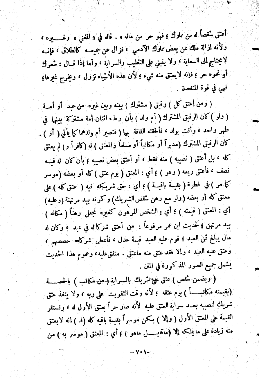 (وَمَنْ أَعْتَقَ كُلَّ) رَقِيقٍ (مُشْتَرَكٍ) بَيْنَهُ وَبَيْنَ غَيْرِهِ مِنْ عَبْدٍ أَوْ أَمَةٍ (وَلَوْ) كَانَ الرَّقِيقُ الْمُشْتَرَكُ (أُمَّ وَلَدٍ) بِأَنْ وَطْء اثْنَانِ أَمَةً مُشْتَرَكَةً بَيْنَهُمَا فِي طُهْرٍ وَاحِدٍ، وَأَتَتْ بِوَلَدٍ، فَأَلْحَقَتْهُ الْقَافَةُ بِهِمَا فَتَصِيرُ أُمَّ وَلَدِهِمَا كَمَا يَأْتِي (أَوْ) كَانَ الرَّقِيقُ الْمُشْتَرَكُ (مُدَبَّرًا أَوْ مُكَاتَبًا أَوْ مُسْلِمًا وَالْمُعْتِقُ) لَهُ (كَافِرًا وَ) لَمْ يُعْتِقْ كُلَّهُ، بَلْ أَعْتَقَ (نَصِيبَهُ) مِنْهُ فَقَطْ، أَوْ أَعْتَقَ بَعْضَ نَصِيبِهِ؛ بِأَنْ كَانَ لَهُ فِيهِ نِصْفٌ، فَأَعْتَقَ رُبُعَهُ (وَهُوَ) ؛ أَيْ: الْمُعْتَقُ (يَوْمَ عَتَقَ) كُلُّهُ أَوْ بَعْضُهُ (مُوسِرٌ) (كَمَا مَرَّ) فِي فِطْرَةٍ (بِقِيمَةٍ بَاقِيَةٍ) ؛ أَيْ: حَقُّ شَرِيكِهِ فِيهِ (عَتَقَ كُلُّهُ) عَلَى مُعْتِقِ كُلِّهِ أَوْ بَعْضِهِ (وَلَوْ مَعَ رَهْنِ شِقْصِ الشَّرِيكِ) وَكَوْنُهُ بِيَدِ مُرْتَهِنِهِ (وَعَلَيْهِ) أَيْ: الْمُعْتِقِ (قِيمَتُهُ) ؛ أَيْ: الشَّخْصِ الْمَرْهُونِ كَغَيْرِهِ تُجْعَلُ رَهْنًا (مَكَانَهُ) بِيَدِ مُرْتَهِنٍ؛ لِحَدِيثِ ابْنِ عُمَرَ مَرْفُوعًا: «مَنْ أَعْتَقَ شِرْكًا لَهُ فِي عَبْدٍ، وَكَانَ لَهُ مَالٌ يَبْلُغُ ثَمَنَ الْعَبْدِ؛ قُوِّمَ عَلَيْهِ الْعَبْدُ قِيمَةَ عَدْلٍ، فَأَعْطَى شُرَكَاءَهُ حِصَصَهُمْ، وَعَتَقَ عَلَيْهِ الْعَبْدُ، وَإِلَّا فَقَدْ عَتَقَ مِنْهُ مَا عَتَقَ» . مُتَّفَقٌ عَلَيْهِ وَعُمُومُ هَذَا الْحَدِيثِ يَشْمَلُ جَمِيعَ الصُّوَرِ الْمَذْكُورَةِ فِي الْمَتْنِ.