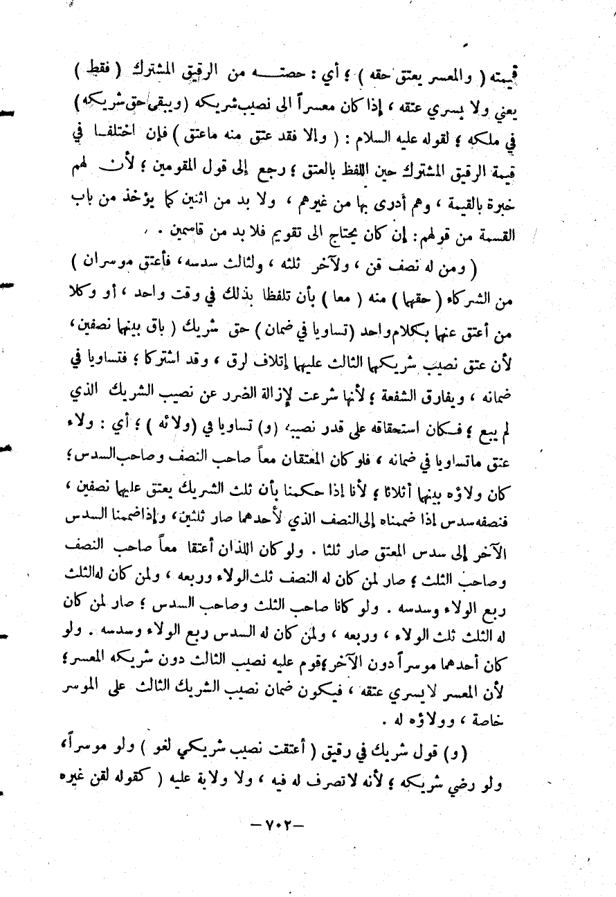 وَلَوْ كَانَ اللَّذَانِ أَعْتَقَا مَعًا صَاحِبَ النِّصْفِ وَصَاحِبَ الثُّلُثِ؛ صَارَ لِمَنْ كَانَ لَهُ النِّصْفُ ثُلُثُ الْوَلَاءِ وَرُبُعُهُ، وَلِمَنْ كَانَ لَهُ الثُّلُثُ رُبُعُ الْوَلَاءِ وَسُدُسُهُ. وَلَوْ كَانَا صَاحِبَ الثُّلُثِ وَصَاحِبَ السُّدُسِ؛ صَارَ لِمَنْ كَانَ لَهُ الثُّلُثُ ثُلُثُ الْوَلَاءِ، وَرُبُعُهُ، وَلِمَنْ كَانَ لَهُ السُّدُسُ رُبُعُ الْوَلَاءِ وَسُدُسُهُ. وَلَوْ كَانَ أَحَدُهُمَا مُوسِرًا دُونَ الْآخَرِ؛ قُوِّمَ عَلَيْهِ نَصِيبُ الثَّالِثِ دُونَ شَرِيكِهِ الْمُعْسِرِ؛ لِأَنَّ الْمُعْسِرَ لَا يَسْرِي عِتْقُهُ، فَيَكُونُ ضَمَانُ نَصِيبِ الشَّرِيكِ الثَّالِثِ عَلَى الْمُوسِرِ خَاصَّةً، وَوَلَاؤُهُ لَهُ.