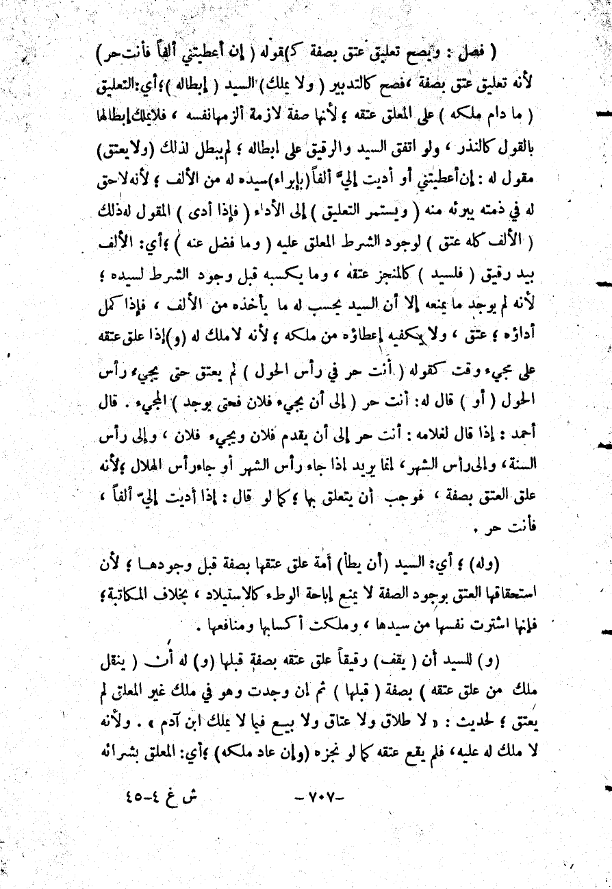 (وَ) لِلسَّيِّدِ أَنْ (يَقِفَ) رَقِيقًا عَلَّقَ عِتْقَهُ بِصِفَةٍ قَبْلهَا (وَ) لَهُ أَنْ (يَنْقُلَ مِلْكَ مِنْ عَلَّقَ عِتْقَهُ) بِصِفَةٍ (قَبْلَهَا) ثُمَّ إنْ وُجِدَتْ وَهُوَ فِي مِلْكِ غَيْرِ الْمُعَلَّقِ لَمْ يَعْتِقْ؛ لِحَدِيثِ: «لَا طَلَاقَ وَلَا عَتَاقَ وَلَا بَيْعَ فِيمَا لَا يَمْلِكُ ابْنُ آدَمَ» .
