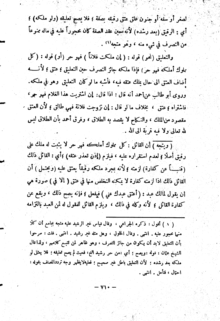 لِصِغَرٍ أَوْ سَفَهٍ أَوْ جُنُونٍ عَلَّقَ عِتْقَ رَقِيقِهِ بِصِفَةٍ؛ فَلَا يَصِحُّ تَعْلِيقُهُ (وَلَوْ مَلَكَهُ) ؛ أَيْ: الرَّقِيقَ (بَعْدَ رُشْدِهِ) لِأَنَّهُ حِينَ عَقَدَ الصِّفَةَ كَانَ مَحْجُورًا عَلَيْهِ فِي مَالِهِ مَمْنُوعًا مِنْ التَّصَرُّفِ فِي شَيْءٍ مِنْهُ، وَهُوَ مُتَّجِهٌ.