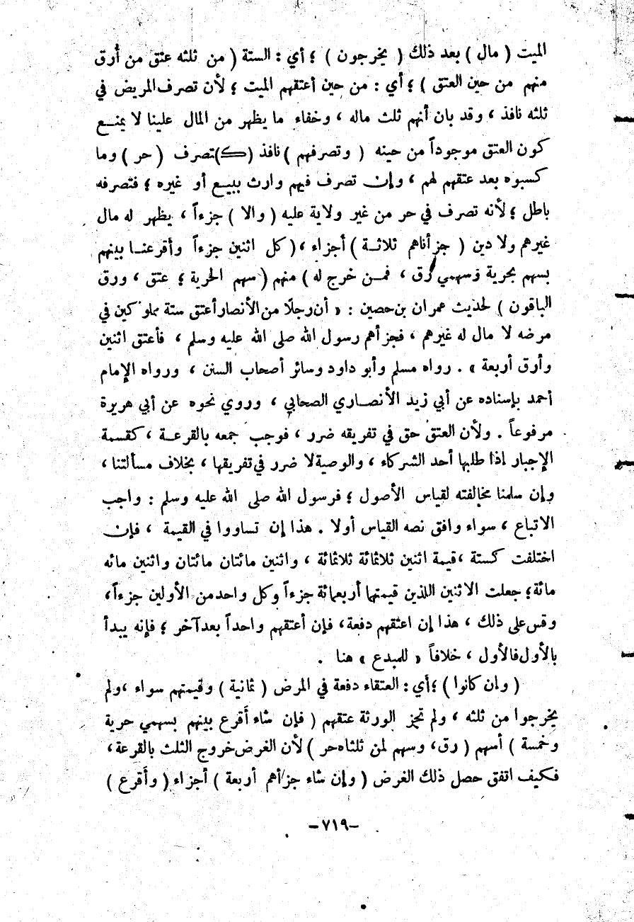 الْمَيِّتِ (مَالٌ) بَعْدَ ذَلِكَ (يَخْرُجُونَ) ؛ أَيْ: السِّتَّةُ (مِنْ ثُلُثِهِ عَتَقَ مَنْ أُرِقَّ مِنْهُمْ مِنْ حِينِ الْعِتْقِ) ؛ أَيْ: مِنْ حِينِ أَعْتَقَهُمْ الْمَيِّتُ؛ لِأَنَّ تَصَرُّفَ الْمَرِيضِ فِي ثُلُثِهِ نَافِذٌ، وَقَدْ بَانَ أَنَّهُمْ ثُلُثُ مَالِهِ، وَخَفَاءُ مَا يَظْهَرُ مِنْ الْمَالِ عَلَيْنَا لَا يَمْنَعُ كَوْنَ الْعِتْقِ مَوْجُودًا مِنْ حِينِهِ (وَتَصَرُّفُهُمْ) نَافِذٌ (كَ) تَصَرُّفِ (حُرٍّ) وَمَا كَسَبُوهُ بَعْدَ عِتْقِهِمْ لَهُمْ، وَإِنْ تَصَرَّفَ فِيهِمْ وَارِثٌ بِبَيْعٍ أَوْ غَيْرِهِ؛ فَتَصَرُّفُهُ بَاطِلٌ؛ لِأَنَّهُ تَصَرَّفَ فِي حُرٍّ مِنْ غَيْرِ وِلَايَةٍ عَلَيْهِ (وَإِلَّا) جُزْءًا، يَظْهَرُ لَهُ مَالٌ غَيْرِهِمْ وَلَا دَيْنَ (جَزَّأْنَاهُمْ ثَلَاثَةَ) أَجْزَاءٍ، (كُلُّ اثْنَيْنِ جُزْءًا وَأَقْرَعنَا بَيْنَهُمْ بِسَهْمٍ بِحُرِّيَّةٍ وَسَهْمَيْ رِقٍّ، فَمَنْ خَرَجَ لَهُ) مِنْهُمْ (سَهْمُ الْحُرِّيَّةِ؛ عَتَقَ، وَرَقَّ الْبَاقُونَ) لِحَدِيثِ عِمْرَانَ بْنِ حُصَيْنٍ: «أَنَّ رَجُلًا مِنْ الْأَنْصَارِ أَعْتَقَ سِتَّةً مَمْلُوكِينَ فِي مَرَضِهِ لَا مَالَ لَهُ غَيْرُهُمْ، فَجَزَّأَهُمْ رَسُولُ اللَّهِ - صَلَّى اللَّهُ عَلَيْهِ وَسَلَّمَ - فَأَعْتَقَ اثْنَيْنِ وَأَرَقَّ أَرْبَعَةً» . رَوَاهُ مُسْلِمٌ وَأَبُو دَاوُد وَسَائِرُ أَصْحَابِ السُّنَنِ، وَرَوَاهُ الْإِمَامُ أَحْمَدُ بِإِسْنَادِهِ عَنْ أَبِي زَيْدٍ الْأَنْصَارِيِّ الصَّحَابِيِّ، وَرُوِيَ نَحْوُهُ عَنْ أَبِي هُرَيْرَةَ مَرْفُوعًا.