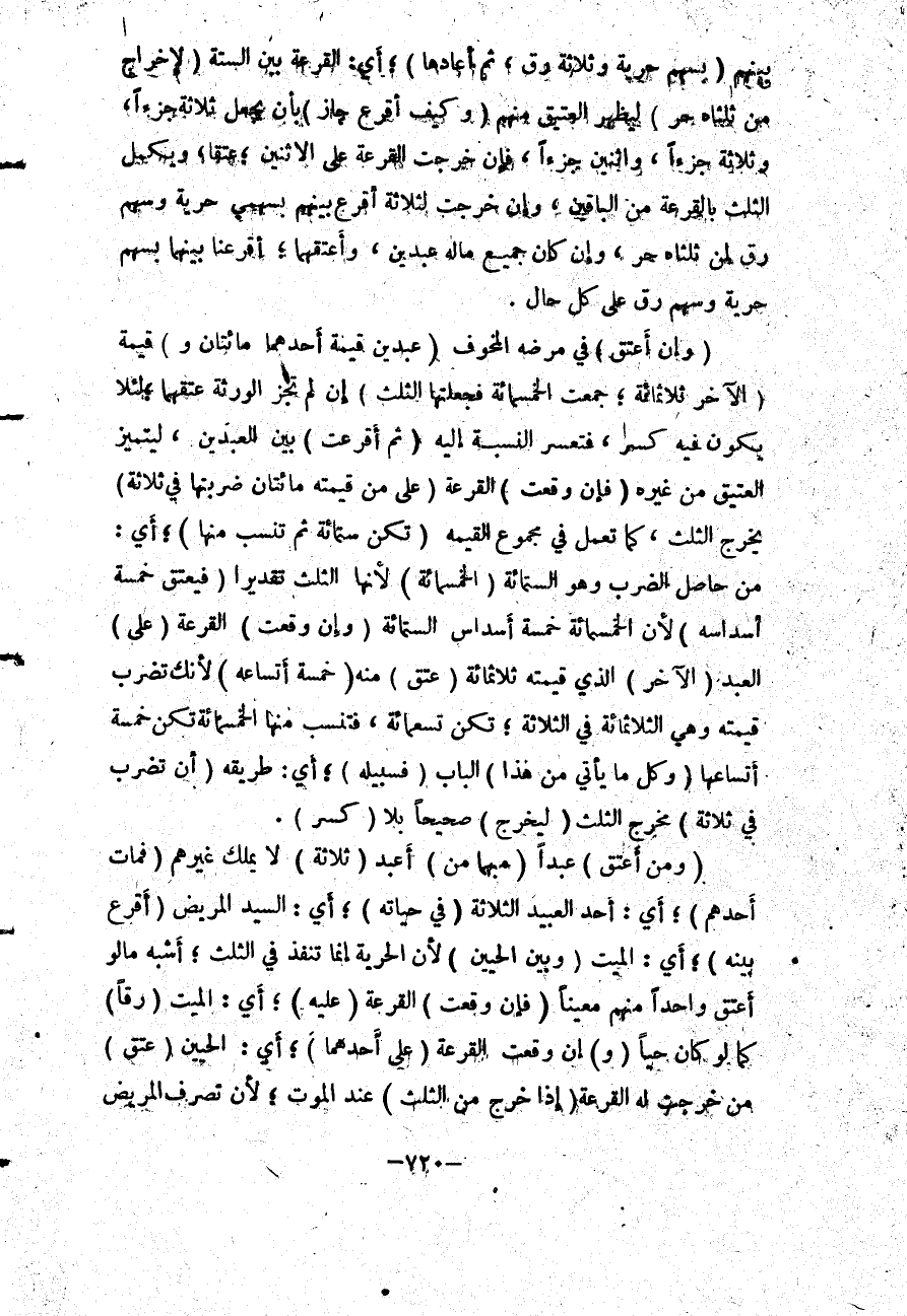 بَيْنَهُمْ (بِسَهْمِ حُرِّيَّةٍ وَثَلَاثَةِ رِقٍّ، ثُمَّ أَعَادَهَا) ؛ أَيْ: الْقُرْعَةَ بَيْنَ السِّتَّةِ (لِإِخْرَاجِ مَنْ ثُلُثَاهُ حُرٌّ) لِيَظْهَرَ الْعَتِيقُ مِنْهُمْ (وَكَيْف أَقْرَعَ جَازَ) بِأَنْ يَجْعَلَ ثَلَاثَةً جُزْءًا، وَثَلَاثَةً جُزْءًا، وَاثْنَيْنِ جُزْءًا، فَإِنْ خَرَجَتْ الْقُرْعَةُ عَلَى الِاثْنَيْنِ؛ عَتَقَا، وَيُكْمِلُ الثُّلُثَ بِالْقُرْعَةِ مِنْ الْبَاقِينَ، وَإِنْ خَرَجَتْ لِثَلَاثَةٍ أَقْرَعَ بَيْنَهُمْ بِسَهْمَيْ حُرِّيَّةٍ وَسَهْمِ رِقٍّ لِمَنْ ثُلُثَاهُ حُرٌّ، وَإِنْ كَانَ جَمِيعُ مَالِهِ عَبْدَيْنِ، وَأَعْتَقَهُمَا؛ أَقْرَعْنَا بَيْنَهُمَا بِسَهْمِ حُرِّيَّةٍ وَسَهْمِ رِقٍّ عَلَى كُلِّ حَالٍّ.