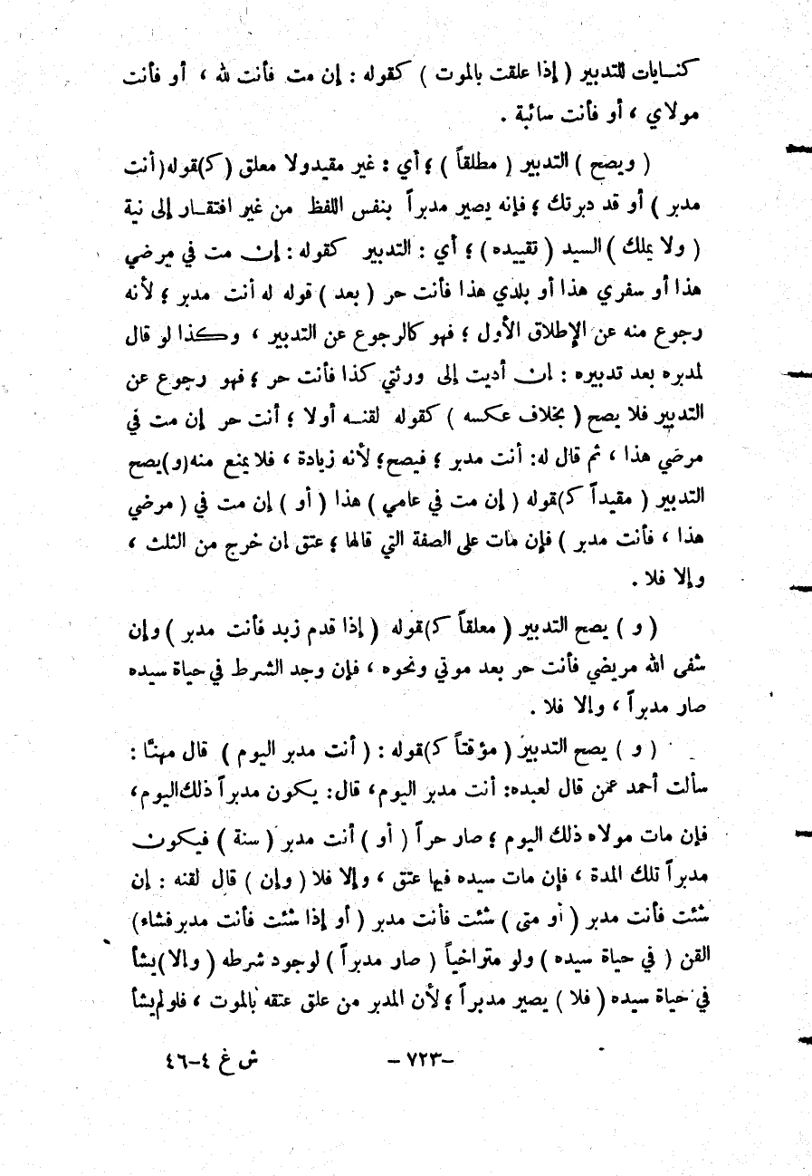 (وَ) يَصِحُّ التَّدْبِيرُ (مُقَيَّدًا كَ) قَوْلِهِ (إنْ مِتَّ فِي عَامِي) هَذَا (أَوْ) إنْ مِتَّ فِي (مَرَضِي هَذَا، فَأَنْتَ مُدَبَّرٌ) فَإِنْ مَاتَ عَلَى الصِّفَةِ الَّتِي قَالَهَا؛ عَتَقَ إنْ خَرَجَ مِنْ الثُّلُثِ، وَإِلَّا فَلَا.