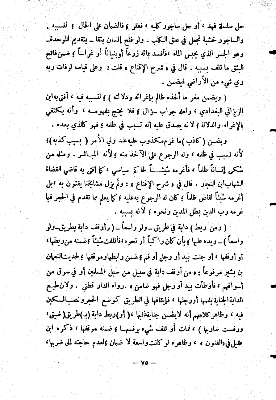 وَلِأَنَّ طَبْعَ الدَّابَّةِ الْجِنَايَةُ بِفَمِهَا أَوْ رِجْلِهَا، فَإِيقَافُهَا فِي الطَّرِيقِ كَوَضْعِ الْحَجَرِ وَنَصْبِ السِّكِّينِ فِيهِ، وَظَاهِرُ كَلَامِهِمْ أَنَّهُ لَا يَضْمَنُ جِنَايَةَ ذَنْبِهَا، (أَوْ) رَبَطَ دَابَّةً (بِ) طَرِيقٍ (ضَيِّقٍ، وَرَفَسَتْ ضَارِبَهَا) ، فَمَاتَ أَوْ تَلِفَ شَيْءٌ بِرَفْسِهَا؛ ضَمِنَهُ مُوقِفُهَا، ذَكَرَهُ ابْنُ عَقِيلٍ فِي الْفُنُونِ "، وَظَاهِرُهُ لَوْ كَانَتْ وَاسِعَةً لَا ضَمَانَ؛ لِعَدَمِ حَاجَتِهِ إلَى ضَرْبِهَا