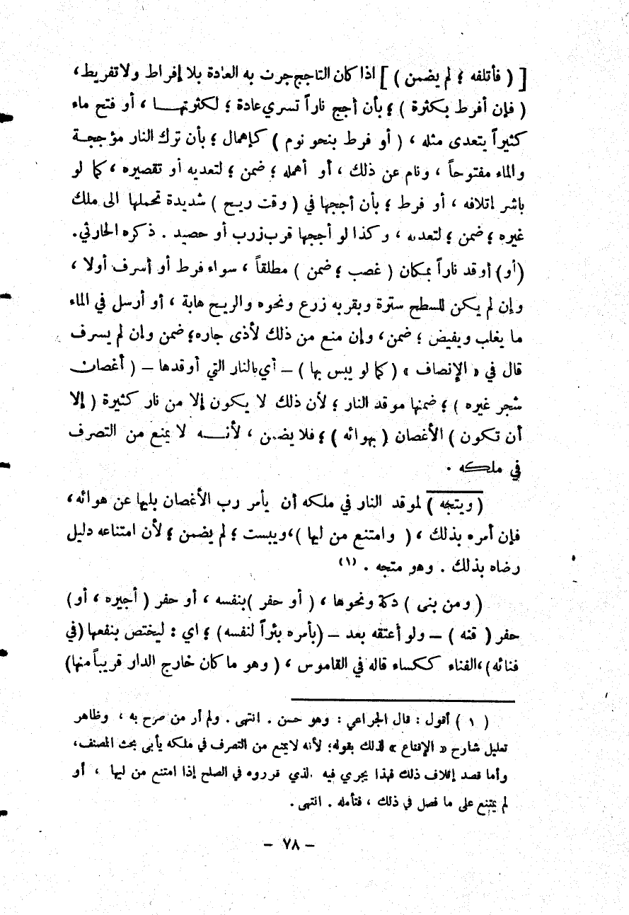 (فَأَتْلَفَهُ؛ لَمْ يَضْمَنْ) ] إذَا كَانَ التَّأَجُّجُ جَرَتْ بِهِ الْعَادَةُ بِلَا إفْرَاطٍ وَلَا تَفْرِيطٍ، (فَإِنْ أَفْرَطَ بِكَثْرَةٍ) ؛ بِأَنْ أَجَّجَ نَارًا تَسْرِي عَادَةً؛ لِكَثْرَتِهَا، أَوْ فَتَحَ مَاءً كَثِيرًا يَتَعَدَّى مِثْلُهُ، (أَوْ فَرَّطَ بِنَحْوِ نَوْمٍ) كَإِهْمَالٍ؛ بِأَنْ تَرَكَ النَّارَ مُؤَجَّجَةً وَالْمَاءَ مَفْتُوحًا، وَنَامَ عَنْ ذَلِكَ، أَوْ أَهْمَلَهُ؛ ضَمِنَ؛ لِتَعَدِّيهِ أَوْ تَقْصِيرِهِ، كَمَا لَوْ بَاشَرَ إتْلَافَهُ، أَوْ فَرَّطَ؛ بِأَنْ أَجَّجَهَا فِي (وَقْتِ رِيحٍ) شَدِيدَةٍ تَحْمِلُهَا إلَى مِلْكِ غَيْرِهِ؛ ضَمِنَ؛ لِتَعَدِّيهِ، وَكَذَا لَوْ أَجَّجَهَا قُرْبَ زَرْبٍ أَوْ حَصِيدٍ.