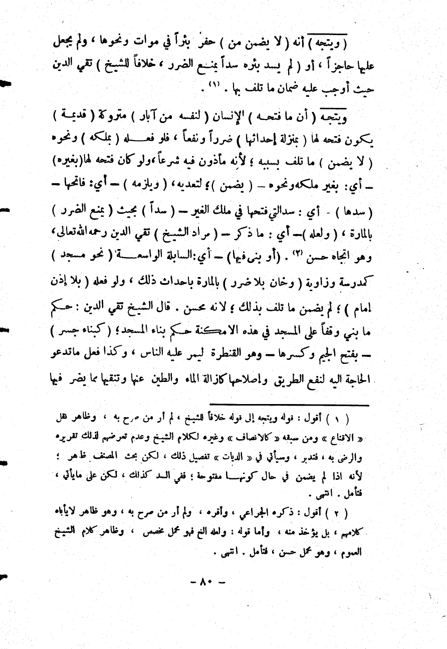 وَيَتَّجِهُ (أَنَّ مَا فَتَحَهُ) الْإِنْسَانُ (لِنَفْسِهِ مِنْ آبَارٍ) مَتْرُوكَةٍ (قَدِيمَةٍ) يَكُونُ فَتْحُهُ لَهَا (بِمَنْزِلَةِ إحْدَاثِهَا) ضَرَرًا وَنَفْعًا، فَلَوْ فَعَلَهُ (بِمِلْكِهِ) وَنَحْوِهِ (لَا يَضْمَنُ) مَا تَلِفَ بِسَبَبِهِ؛ لِأَنَّهُ مَأْذُونٌ فِيهِ شَرْعًا، وَلَوْ كَانَ فَتْحُهُ لَهَا (بِغَيْرِهِ) - أَيْ: بِغَيْرِ مِلْكِهِ وَنَحْوِهِ - (يَضْمَنُ) ؛ لِتَعَدِّيهِ، (وَيَلْزَمُهُ) - أَيْ: فَاتِحَهَا - (سَدُّهَا) - أَيْ: سَدُّ الَّتِي فَتَحَهَا فِي مِلْكِ الْغَيْرِ - (سَدًّا) بِحَيْثُ (يَمْنَعُ الضَّرَرَ) بِالْمَارَّةِ، (وَلَعَلَّهُ) - أَيْ: مَا ذُكِرَ - (مُرَادُ الشَّيْخِ تَقِيِّ الدِّينِ - رَحِمَهُ اللَّهُ تَعَالَى -) ، وَهُوَ اتِّجَاهٌ حَسَنٌ.