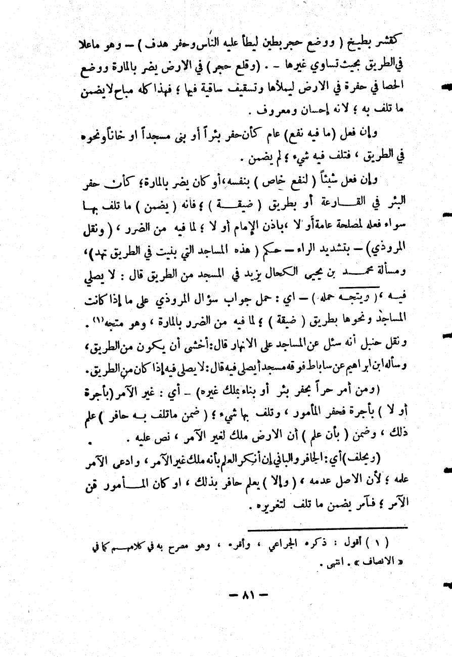 وَإِنْ فَعَلَ شَيْئًا (لِنَفْعٍ خَاصٍّ) بِنَفْسِهِ، أَوْ كَانَ يَضُرُّ بِالْمَارَّةِ؛ كَأَنْ حَفَرَ الْبِئْرَ فِي الْقَارِعَةِ أَوْ بِطَرِيقٍ (ضَيِّقَةٍ) ؛ فَإِنَّهُ (يَضْمَنُ) مَا تَلِفَ بِهَا سَوَاءٌ فَعَلَهُ لِمَصْلَحَةٍ عَامَّةٍ أَوْ لَا، بِإِذْنِ الْإِمَامِ أَوْ لَا؛ لِمَا فِيهِ مِنْ الضَّرَرِ، (وَنَقَلَ الْمَرُّوذِيُّ) - بِتَشْدِيدِ الرَّاءِ - حُكْمَ (هَذِهِ الْمَسَاجِدِ الَّتِي بُنِيَتْ فِي الطَّرِيقِ تُهَدُّ) ، وَمَسْأَلَةُ مُحَمَّدِ بْنِ يَحْيَى الْكَحَّالِ يَزِيدُ فِي الْمَسْجِدِ مِنْ الطَّرِيقِ قَالَ: لَا يُصَلَّى فِيهِ، (وَيَتَّجِهُ حَمْلُهُ) - أَيْ: حَمْلُ جَوَابِ سُؤَالِ الْمَرُّوذِيِّ عَلَى مَا إذَا كَانَتْ الْمَسَاجِدُ وَنَحْوُهَا بِطَرِيقٍ (ضَيِّقَةٍ) ؛ لِمَا فِيهِ مِنْ الضَّرَرِ بِالْمَارَّةِ، وَهُوَ مُتَّجِهٌ.