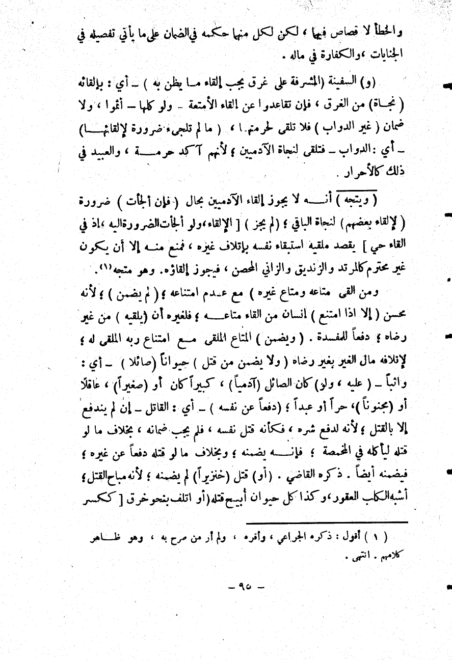 (وَيَتَّجِهُ) أَنَّهُ لَا يَجُوزُ إلْقَاءُ الْآدَمِيِّينَ بِحَالٍ (فَإِنْ أَلْجَأَتْ) ضَرُورَةٌ (لِإِلْقَاءِ بَعْضِهِمْ) لِنَجَاةِ الْبَاقِي؛ (لَمْ يَجُزْ) [الْإِلْقَاءُ، وَلَوْ أَلْجَأَتْ الضَّرُورَةُ إلَيْهِ، إذْ فِيهِ إلْقَاءُ حَيٍّ] يَقْصِدُ مُلْقِيهِ اسْتِبْقَاءَ نَفْسِهِ بِإِتْلَافِ غَيْرِهِ، فَمُنِعَ مِنْهُ إلَّا أَنْ يَكُونَ غَيْرَ مُحْتَرَمٍ كَالْمُرْتَدِّ وَالزِّنْدِيقِ وَالزَّانِي الْمُحْصَنِ، فَيَجُوزُ إلْقَاؤُهُ. وَهُوَ مُتَّجِهٌ.