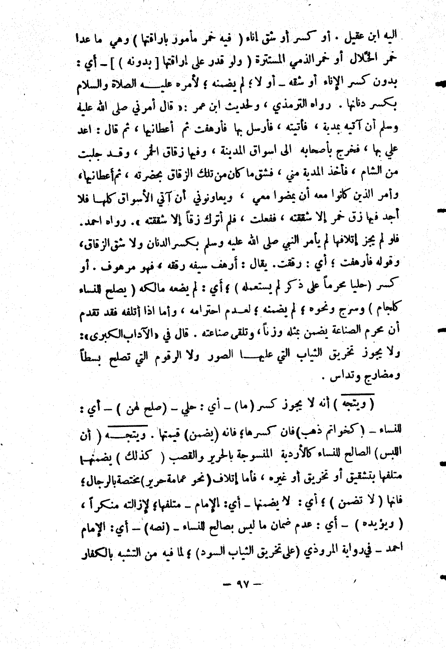 رَوَاهُ التِّرْمِذِيُّ، «وَلِحَدِيثِ ابْنِ عُمَرَ: قَالَ أَمَرَنِي - صَلَّى اللَّهُ عَلَيْهِ وَسَلَّمَ - أَنْ آتِيَهُ بِمُدْيَةٍ، فَأَتَيْته، فَأَرْسَلَ بِهَا فَأُرْهِفَتْ ثُمَّ أَعْطَانِيهَا، ثُمَّ قَالَ: اُغْدُ عَلَيَّ بِهَا، فَخَرَجَ بِأَصْحَابِهِ إلَى أَسْوَاقِ الْمَدِينَةِ، وَفِيهَا زِقَاقُ الْخَمْرِ، وَقَدْ جُلِبَتْ مِنْ الشَّامِ، فَأَخَذَ الْمُدْيَةَ مِنِّي، فَشَقَّ مَا كَانَ مِنْ تِلْكَ الزِّقَاقِ بِحَضْرَتِهِ، ثُمَّ أَعْطَانِيهَا، وَأَمَرَ الَّذِينَ كَانُوا مَعَهُ أَنْ يَمْضُوا مَعِي، وَيُعَاوِنُونِي أَنْ آتِيَ الْأَسْوَاقَ كُلَّهَا فَلَا أَجِدُ فِيهَا زِقَّ خَمْرٍ إلَّا شَقَقْتُهُ، فَفَعَلْت، فَلَمْ أَتْرُكْ زِقًّا إلَّا شَقَقْتُهُ» . رَوَاهُ أَحْمَدُ.