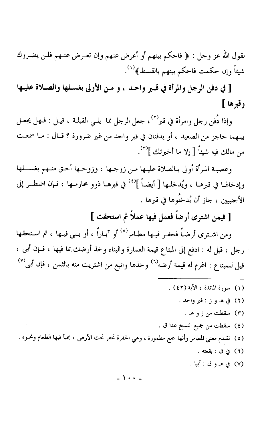 3563 - ومن اشترى أرضاً فحفر فيها مطامر أو آباراً، أو بنى فيها، ثم استحقها رجل، قيل له: ادفع إلى المبتاع قيمة العمارة والبناء وخذ أرضك بما فيها، فإن أبى، قيل للمبتاع: اغرم له قيمة أرضه وخذها واتبع من اشتريت منه بالثمن، فإن أبى