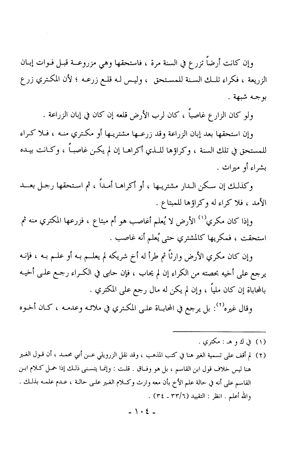 وإذا كان مكري الأرض لا يُعلم أغاصب هو أم مبتاع، فزرعها المكتري منه ثم استحقت، فمكريها كالمشتري حتى يُعلم أنه غاصب.