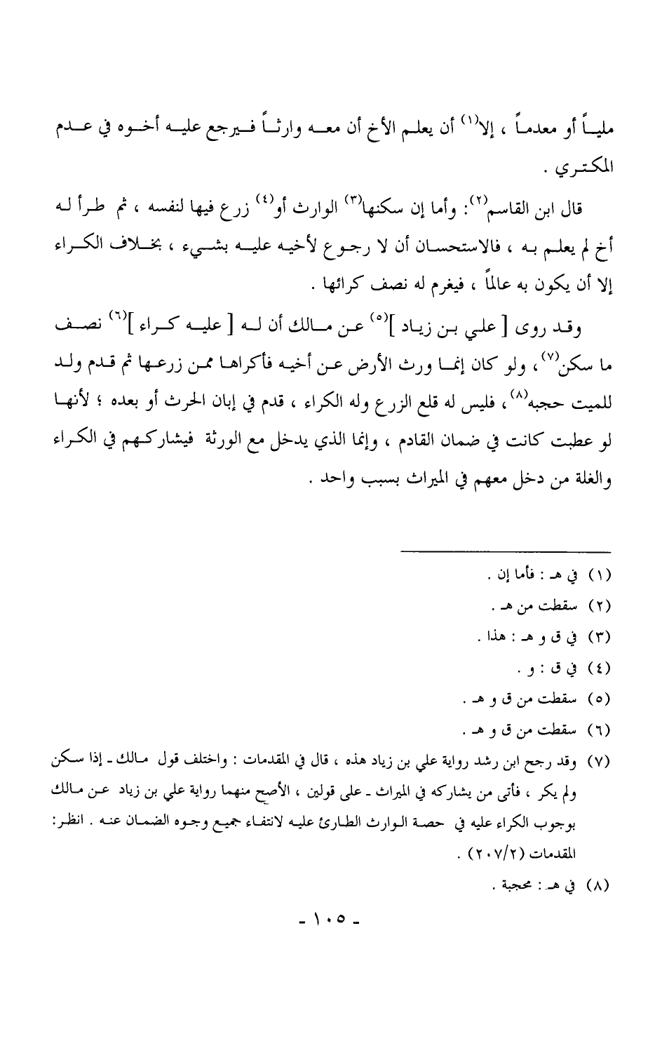وقد روى [علي بن زياد] عن مالك أن له [عليه كراء] نصف ما سكن، ولو كان إنما ورث الأرض عن أخيه فأكراها ممن زرعها ثم قدم ولد للميت حجبه، فليس له قلع الزرع وله الكراء، قدم في إبان الحرث أو بعده، لأنها لو عطبت كانت في ضمان القادم، وإنما الذي يدخل مع الورثة فيشاركهم في الكراء والغلة من دخل معهم في الميراث بسبب واحد.