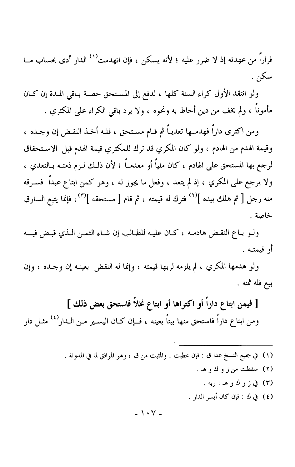 ومن اكترى داراً فهدمها تعدياً ثم قام مستحق، فله أخذ النقض إن وجده، وقيمة الهدم من الهادم، ولو كان المكري قد ترك للمكتري قيمة الهدم قبل الاستحقاق لرجع بها المستحق على الهادم، كان ملياً أو معدماً، لأن ذلك لزم ذمته بالتعدي، ولا يرجع على المكري، إذ لم يتعد، وفعل ما يجوز له، وهو كمن ابتاع عبداً فسرقه منه رجل [ثم هلك بيده] فترك له قيمته، ثم قام [مستحقه] ، فإنما يتبع السارق خاصة.