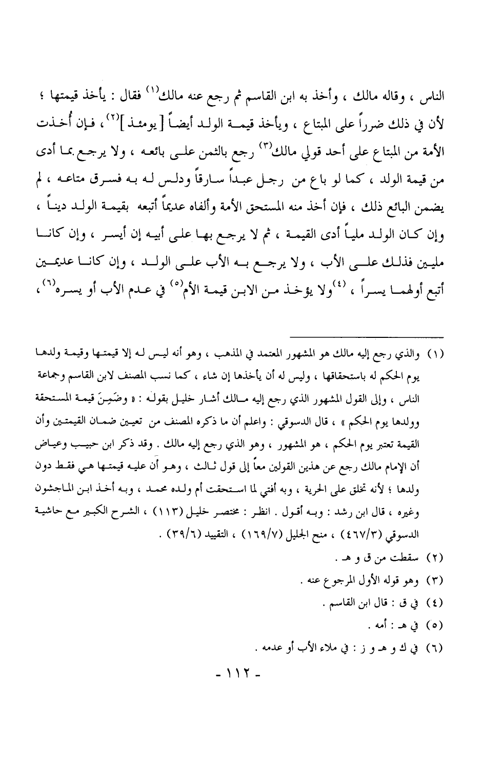 الناس، وقاله مالك، وأخذ به ابن القاسم ثم رجع عنه مالك فقال: يأخذ قيمتها، لأن في ذلك ضرراً على المبتاع، ويأخذ قيمة الولد أيضاً [يومئذ] ٍ، فإن أُخذت الأمة من المبتاع على أحد قولي مالك رجع بالثمن على بائعه، ولا يرجع بما أدى من قيمة الولد، كما لو باع من رجل عبداً سارقاً ودلس له به فسرق متاعه، لم يضمن البائع ذلك، فإن أخذ منه المستحق الأمة وألفاه عديماً أتبعه بقيمة الولد ديناً، وإن كان الولد ملياً أدى القيمة، ثم لا يرجع بها على أبيه إن أيسر، وإن كانا مليين فذلك على الأب، ولا يرجع به الأب على الولد، وإن كانا عديمين أتبع أولهما يسراً، ولا يؤخذ من الابن قيمة الأم في عدم الأب أو يسره،