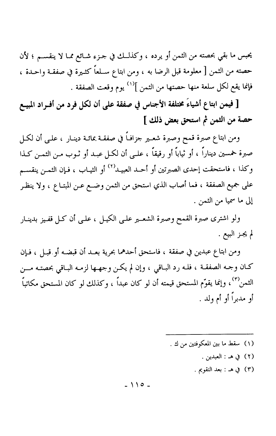 3584 - ومن ابتاع صبرة قمح وصبرة شعير جزافاً في صفقة بمائة دينار، على أن لكل صبرة خمسين ديناراً، أو ثياباً أو رقيقاً، على أن لكل عبد أو ثوب من الثمن كذا وكذا، فاستحقت إحدى الصبرتين أو أحد العبيد أو الثياب، فإن الثمن ينقسم على جميع الصفقة، فما أصاب الذي استحق من الثمن وضع عن المبتاع، ولا ينظر إلى ما سميا من الثمن.