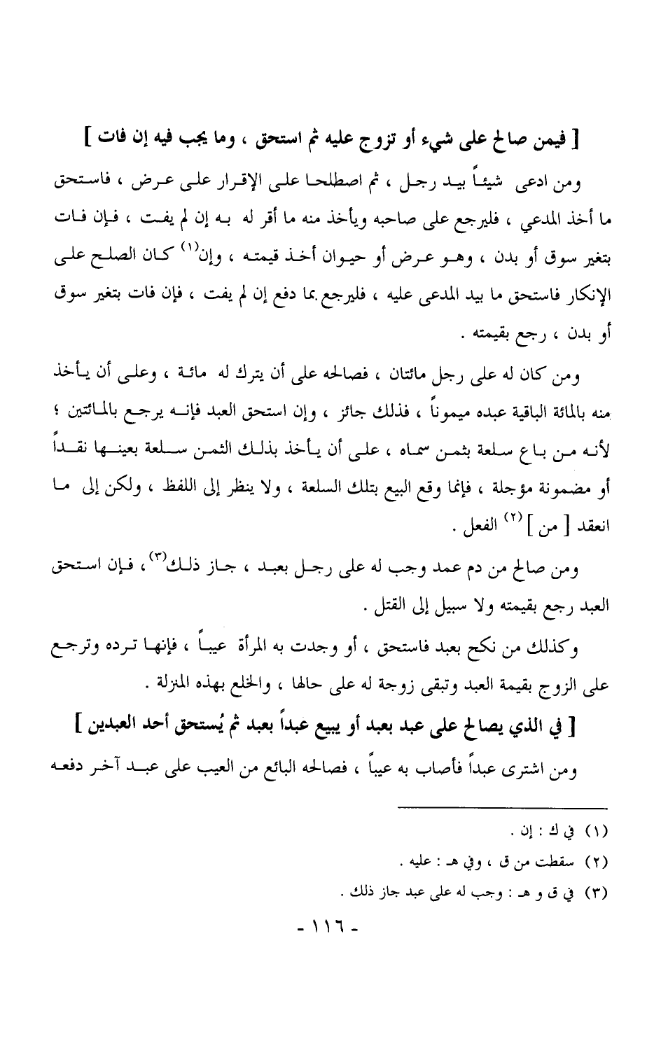 3586 - ومن ادعى شيئاً بيد رجل، ثم اصطلحا على الإقرار على عرض، فاستحق ما أخذ المدعي، فليرجع على صاحبه ويأخذ منه ما أقر له به إن لم يفت، فإن فات بتغير سوق أو بدن، وهو عرض أو حيوان أخذ قيمته، وإن كان الصلح على الإنكار فاستحق ما بيد المدعى عليه، فليرجع بما دفع إن لم يفت، فإن فات بتغير سوق أو بدن، رجع بقيمته.