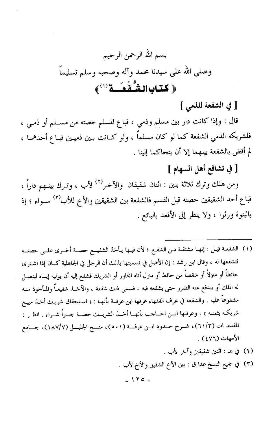 3601 - ومن هلك وترك ثلاثة بنين: اثنان شقيقان والآخر لأب، وترك بينهم داراً، فباع أحد الشقيقين حصته قبل القسم فالشفعة بين الشقيقين والأخ للأب سواء، إذ بالبنوة ورثوا، ولا ينظر إلى الأقعد بالبائع.