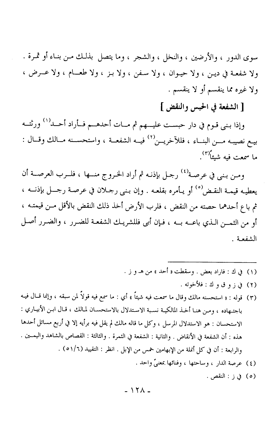 3604 - وإذا بنى قوم في دار حبست عليهم ثم مات أحدهم فأراد أحد ورثته بيع نصيبه من البناء، فللآخرين فيه الشفعة، واستحسنه مالك وقال: ما سمعت فيه شيئاً.