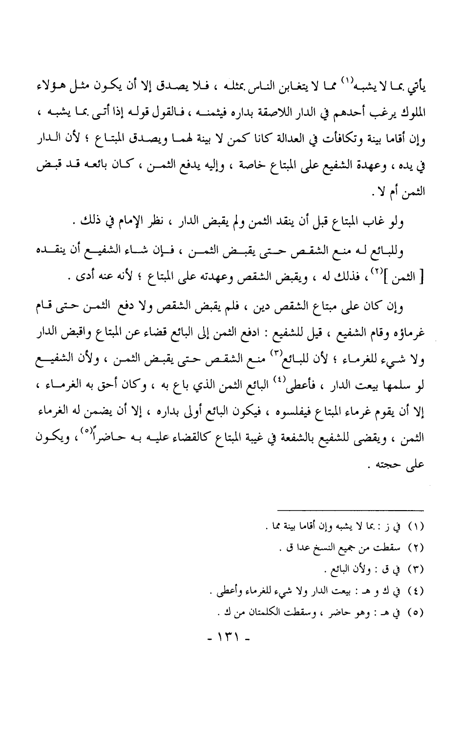 يأتي بما لا يشبه مما لا يتغابن الناس بمثله، فلا يصدق إلا أن يكون مثل هؤلاء الملوك يرغب أحدهم في الدار اللاصقة بداره فيثمنه، فالقول قوله إذا أتى بما يشبه، وإن أقاما بينة وتكافأت في العدالة كانا كمن لا بينة لهما ويصدق المبتاع، لأن الدار في يده، وعهدة الشفيع على المبتاع خاصة، وإليه يدفع الثمن، كان بائعه قد قبض الثمن أم لا.