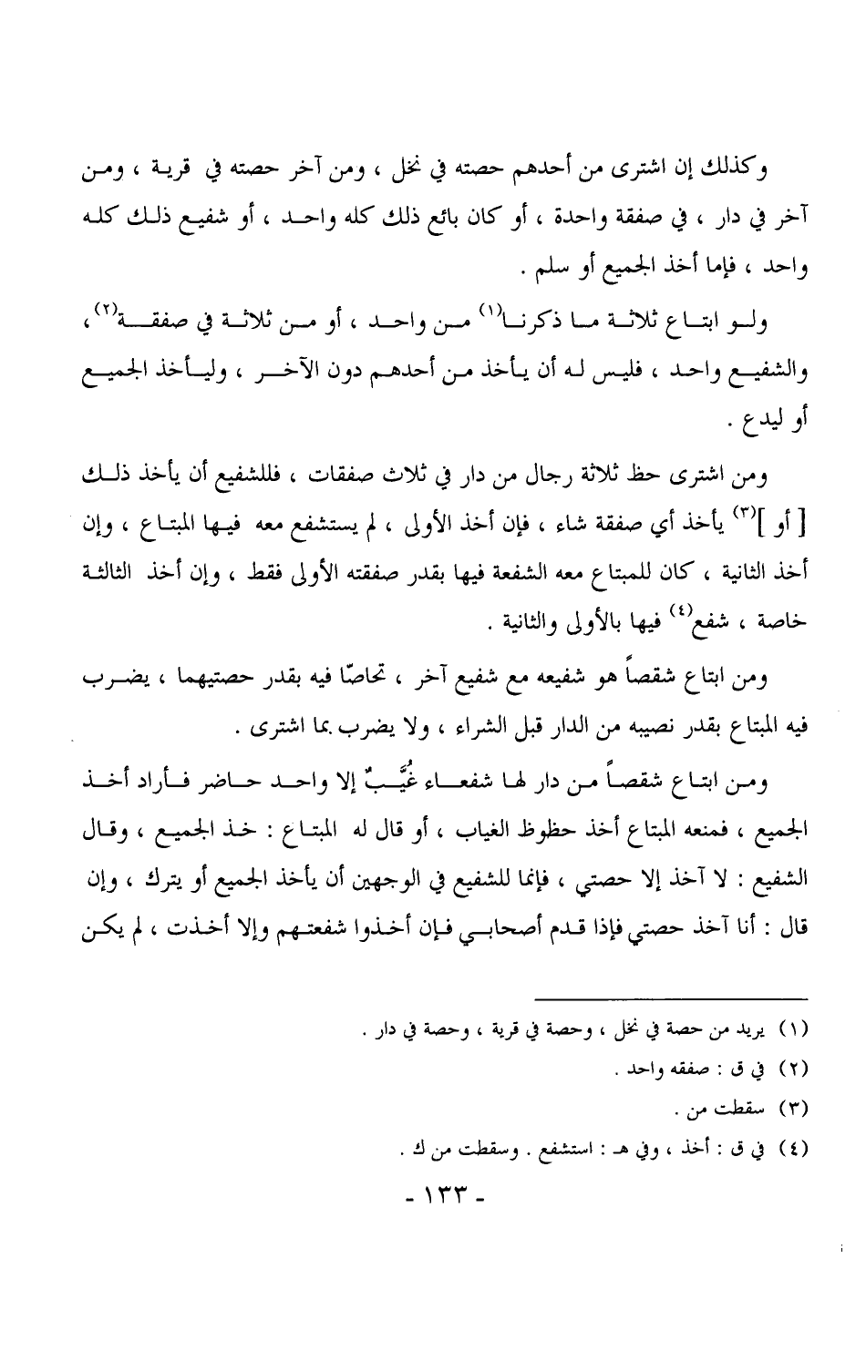 وكذلك إن اشترى من أحدهم حصته في نخل، ومن آخر حصته في قرية، ومن آخر في دار، في صفقة واحدة، أو كان بائع ذلك كله واحد، أو شفيع ذلك كله واحد، فإما أخذ الجميع أو سلم.