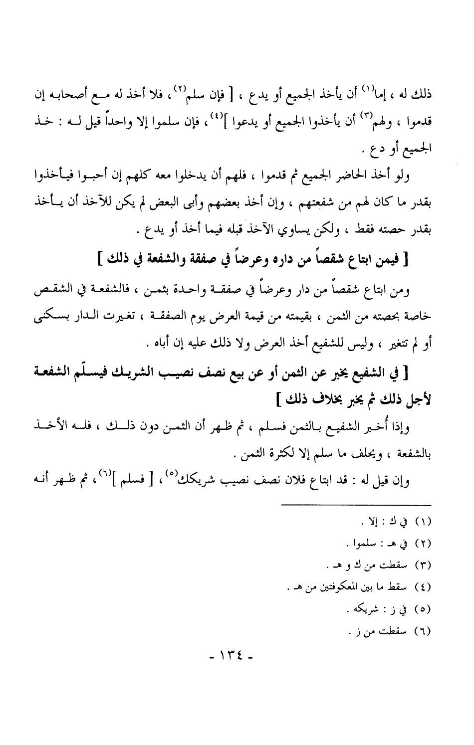 3615 - ومن ابتاع شقصاً من دار وعرضاً في صفقة واحدة بثمن، فالشفعة في الشقص خاصة بحصته من الثمن، بقيمته من قيمة العرض يوم الصفقة، تغيرت الدار بسكنى أو لم تتغير، وليس للشفيع أخذ العرض ولا ذلك عليه إن أباه.